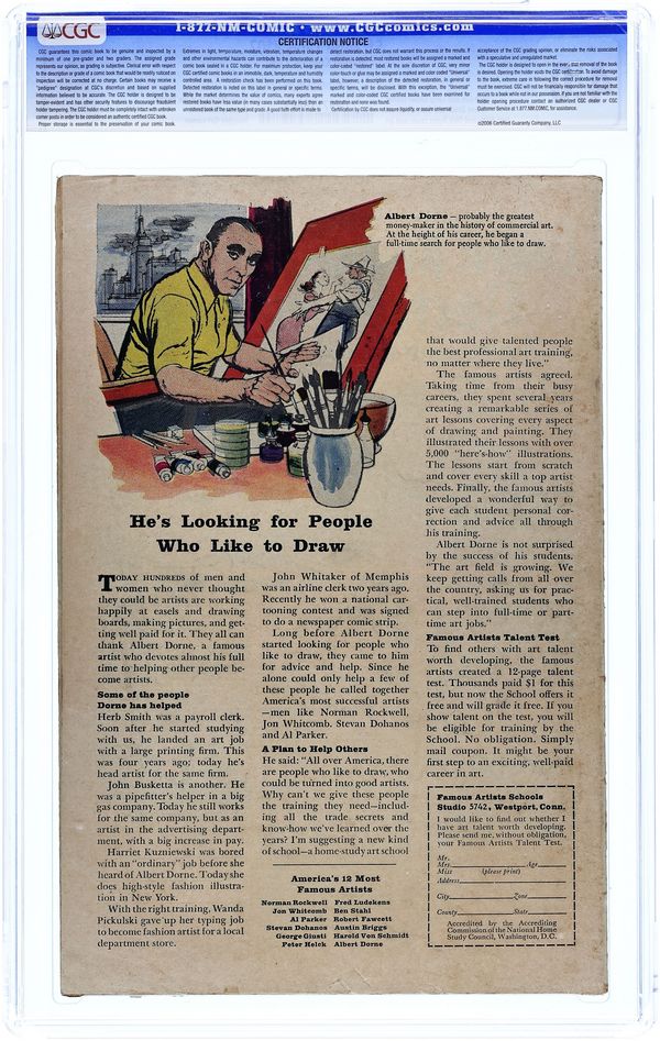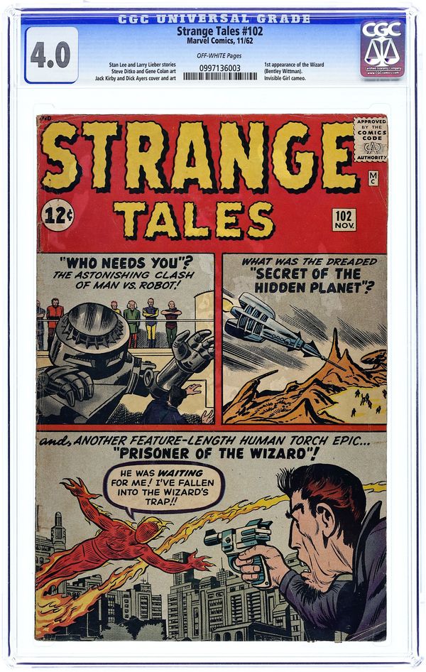Cover pencils by Jack Kirby, inks by Dick Ayers. The Human Torch stars in "Prisoner of the Wizard," script by Stan Lee (plot) and Larry Lieber (script), pencils by Jack Kirby, inks by Dick Ayers; The Human Torch is tricked and trapped by the renowned genius the Wizard, who impersonates the Torch to frame him for crimes. "The Treasure" text story. "The Secret of the Hidden Planet!", pencils by Gene Colan; Human-like aliens are seen on Venus, and a wicked pilot poisons his rival to be able to make first contact. "Who Needs You?", script by Stan Lee, art by Steve Ditko; A general who has the responsibility of launching a nuclear counter attack is replaced by a robot that his bosses think is more suited for a role that requires perfection; When an unidentified radar object approaches at ICBM speed, the robot concludes that it must be a Soviet first strike and prepares to launch a counter attack. 36 pgs., full color. Cover price $0.12. Grade: CGC 4.0 explanation of grade Condition: Used (collectible)