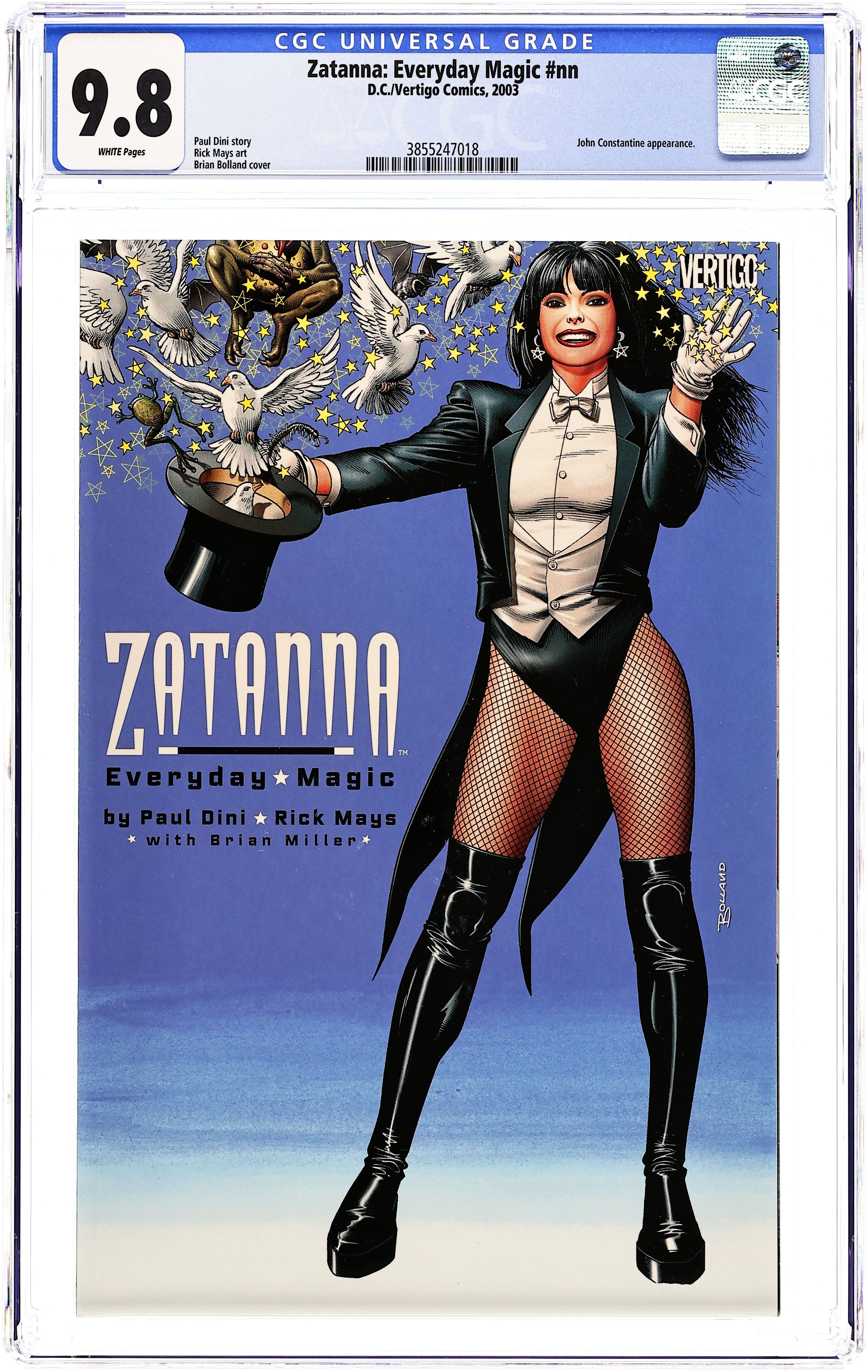 Starts Mar 16 WRITTEN BY PAUL DINI; ART BY RICK MAYS; COVER BY BRIAN BOLLAND Everyone's favorite magician is up to her old tricks again in this Prestige Format one- shot! Although the sexy sorceress is riding high on a wave of popularity thanks to her stage act, she can't seem to sort out her personal life in order. And when old flame John Constantine comes back into her life, it can only mean trouble. For more information, see the feature article. MATURE READERS FC, 48 PG. PRESTIGE FORMAT $5.95 Cover price $5.95. Grade: CGC 9.8 explanation of grade Condition: Used (collectible)