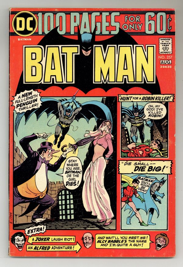 Starts Mar 9 100-page giant. Cover by Nick Cardy. "Hail Emperor Penguin!", script by Denny O'Neil, pencils by Irv Novick, inks by Dick Giordano; When a young King is kidnapped by the Penguin, it takes the efforts of Batman, Robin and Talia to free him from the madman's clutches. The Penguin's Unique Umbrellas! panels from previous comics. "Hunt for a Robin-Killer!", script by Gardner F. Fox, art by Gil Kane; After finding the Boy Wonder nearly dead from a brutal beating, a vengeful Batman hits the streets to find the man responsible. One-page Casey the Cop story by Henry Boltinoff. "Ally Babble and the Fourteen Peeves!", script by Bill Finger, art by Dick Sprang; Ally Babble accepts the offer of $5000 from a rich man to eliminate 14 peeves he has against others, but is soon charged with ripping off the man who paid him. "Conversational Clue!", script by Mort Weisinger, art by Jerry Robinson; When Alfred accidently hears some unsettling conversation in a local library, he follows the clue up...which nearly costs him his life! "Die Small--Die Big!", script by Robert Kanigher, pencils by Bob Brown, inks by Joe Giella; The appearance of a man dressed as the Batman at a party at Wayne Mansion and carrying a death threat for the Caped Crusader spurs Batman to attack the problem alone without the aid of Robin. "Rackety-Rax Racket!", script by Don Cameron, art by Dick Sprang (as Bob Kane); A series of crazy college initiations are actually a blind for daring thefts masterminded by the Joker! 100 Pages, Full Color. Cover price $0.60. Grade: VG 4.0 explanation of grade Condition: Used (collectible)