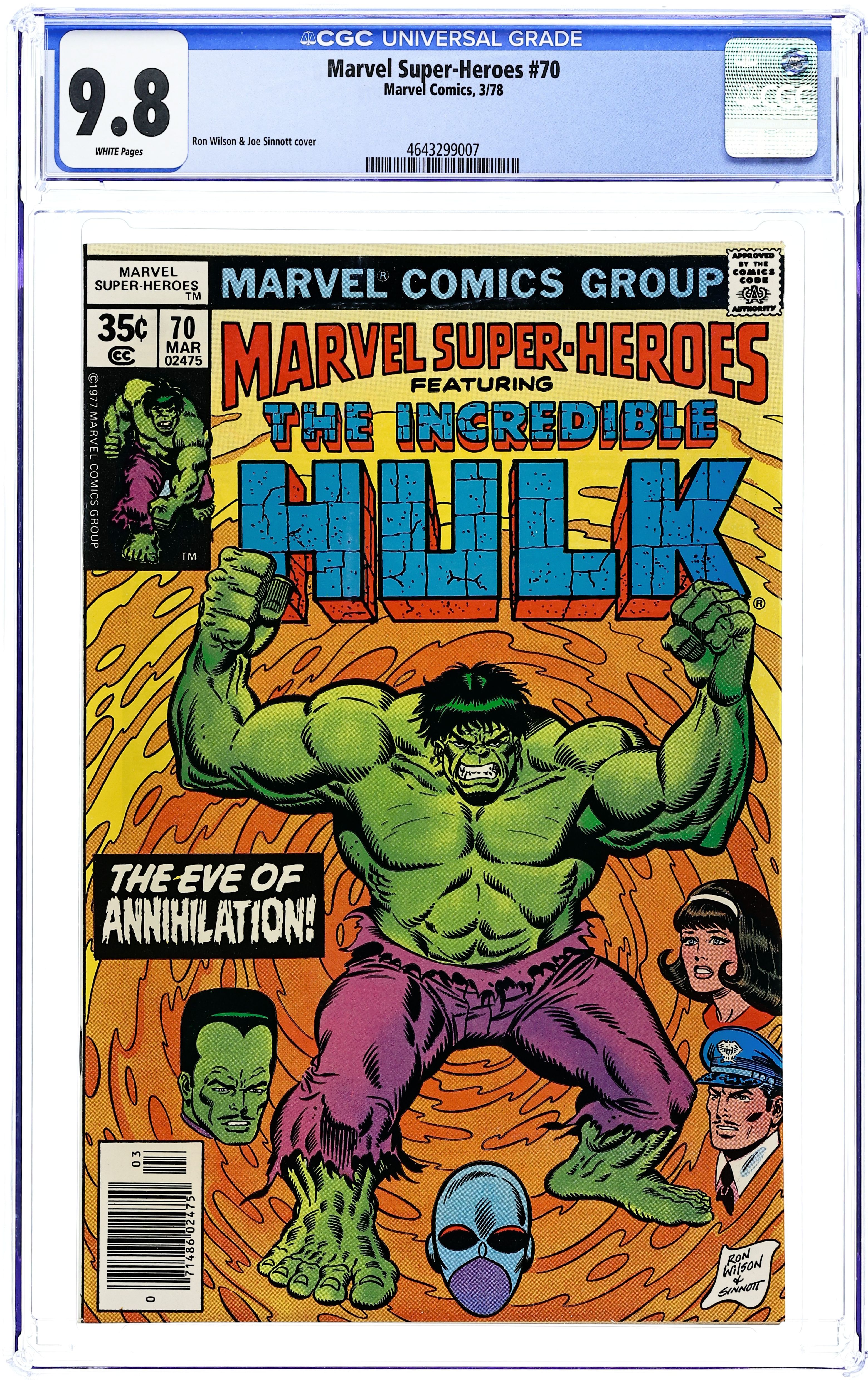 Originally presented in Incredible Hulk (1962-1999 1st series) #116 - "The Eve of Annihilation!" Written by Stan Lee. Art by Herb Trimpe and Dan Adkins. With the Hulk out of the way, the Leader's diabolical plan is set in motion. 32 pages, FC. Cover price $0.30. Grade: CGC 9.8 explanation of grade Condition: Used (collectible)