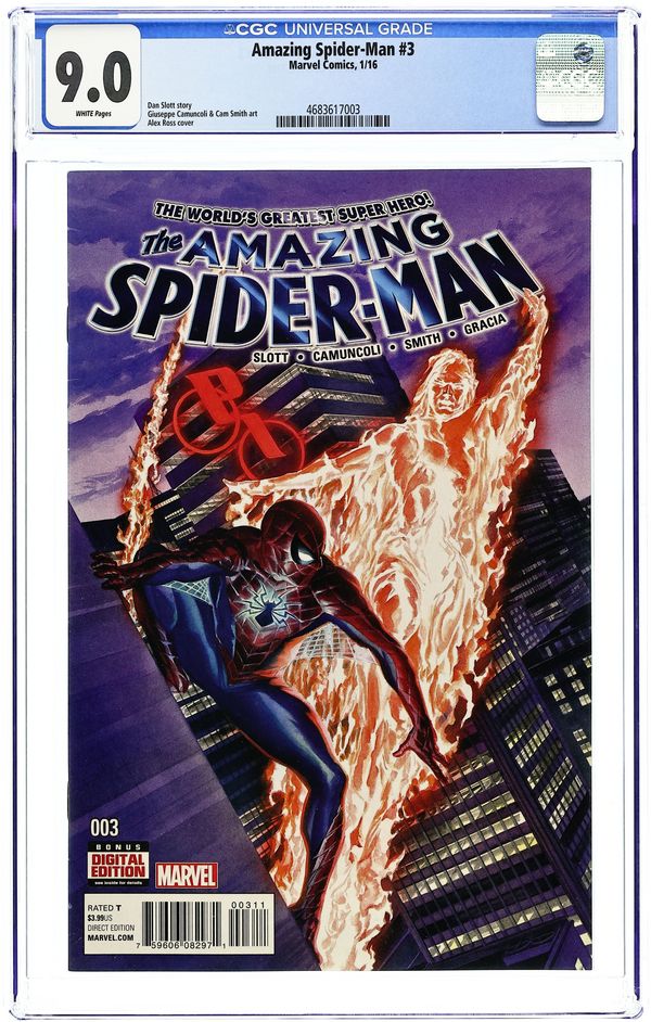 Starts Mar 9 Written by Dan Slott. Art by Giuseppe Camuncoli. Cover by Alex Ross. More of Spider-Man's post-Secret Wars world revealed! Visit Parker Industries New York Headquarters, the building formerly known as the Baxter Building! The Human Torch is going to have something to say about that! 28 pages, full color. Rated T Cover price $3.99. Grade: CGC 9.0 explanation of grade Condition: Used (collectible)