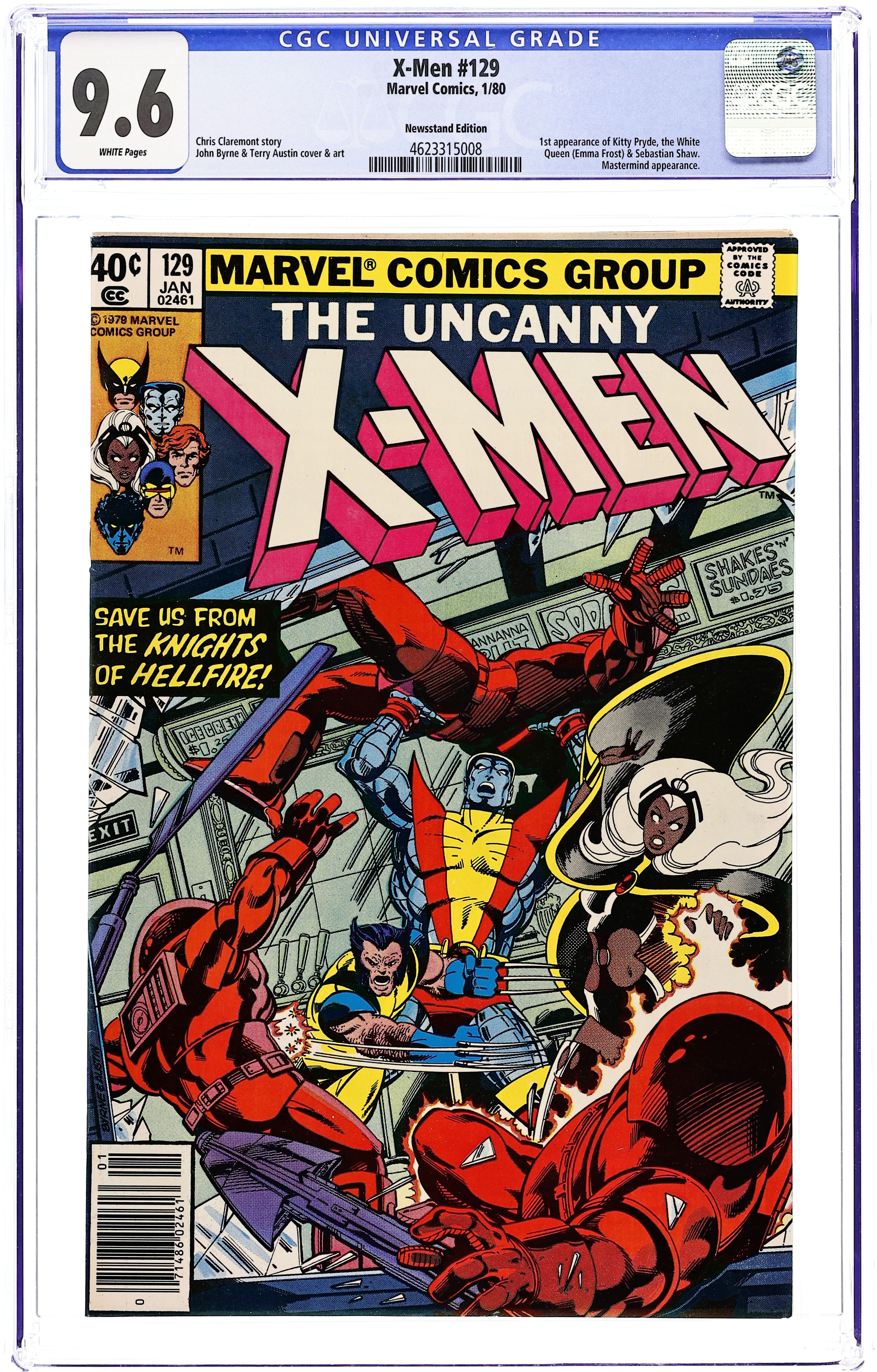 Newsstand Edition. The Dark Phoenix Saga: Part 1 of 9 - "God Spare the Children!" Story by Chris Claremont and John Byrne. Art by John Byrne and Terry Austin. This issue begins arguably the greatest and most tragic X-Men adventure of all time - The Dark Phoenix Saga. While the X-Men attempt to recruit a "New Mutant" by the name of Kitty Pryde, Wolverine, Colossus, and Storm are suddenly attacked by unknown assailants. What do these armored foes want, and who is the White Queen? 36 pages, full color. NOTE: 1st appearance of Kitty Pryde and Emma Frost, the White Queen. Cover price $0.40. Grade: CGC 9.6 explanation of grade Condition: Used (collectible)