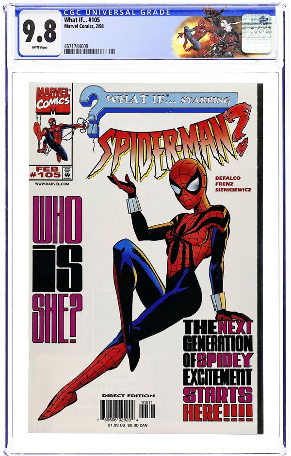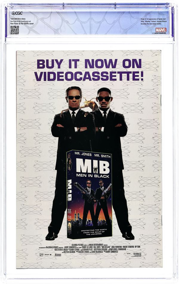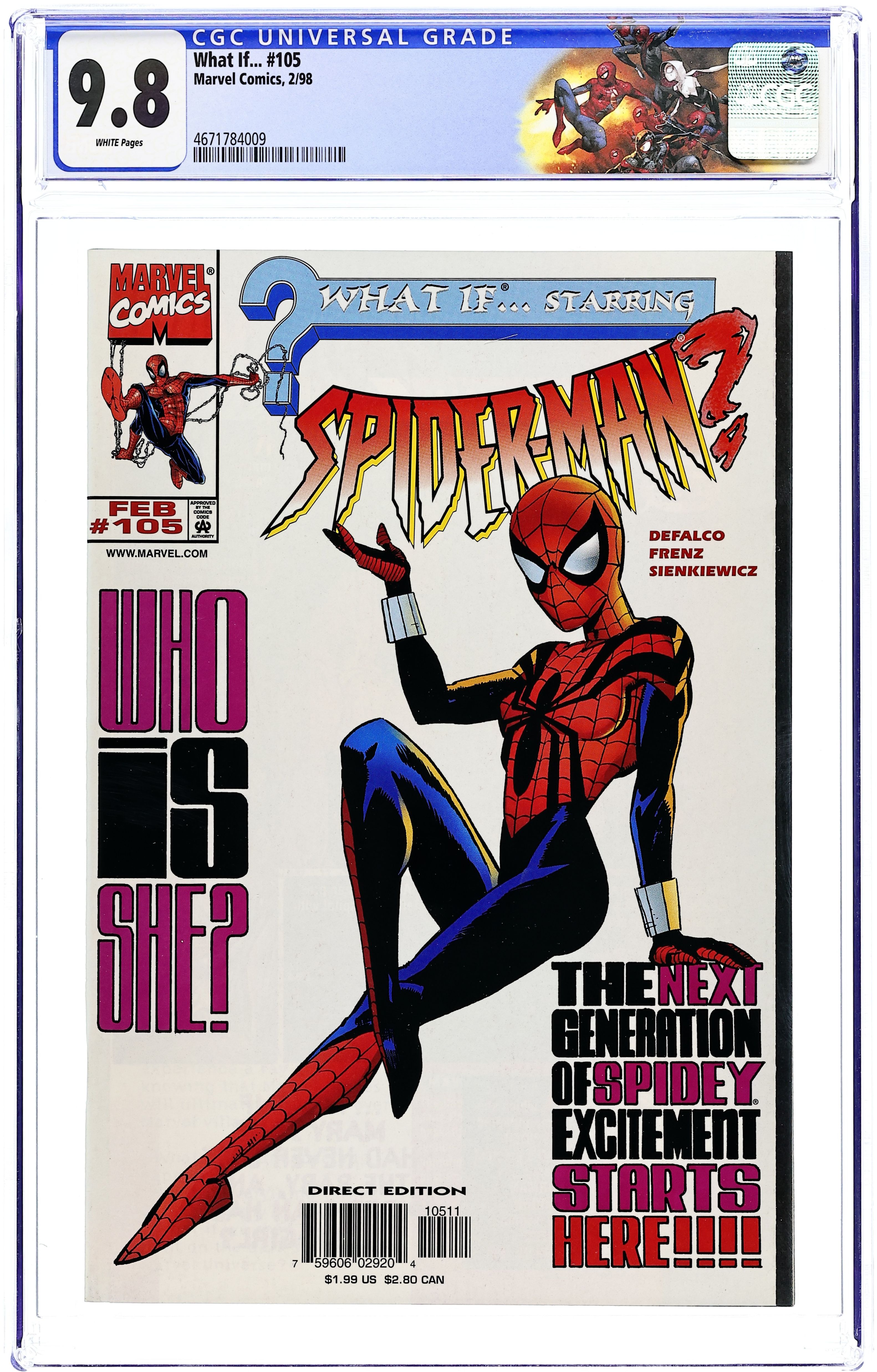 Direct Edition. Legacy...., script by Tom Defalco (Plot and Script) and Ron Frenz (Plot), pencils by Ron Frenz, inks by Bill Sienkiewicz; In the future, the grown Normie Osborn becomes the Greeen Goblin and the daughter of Spider-Man must stop him; introduction and Origin of Spider-Girl. 38 pages, full color. Cover price $1.99. Grade: CGC 9.8 explanation of grade Condition: Used (collectible)