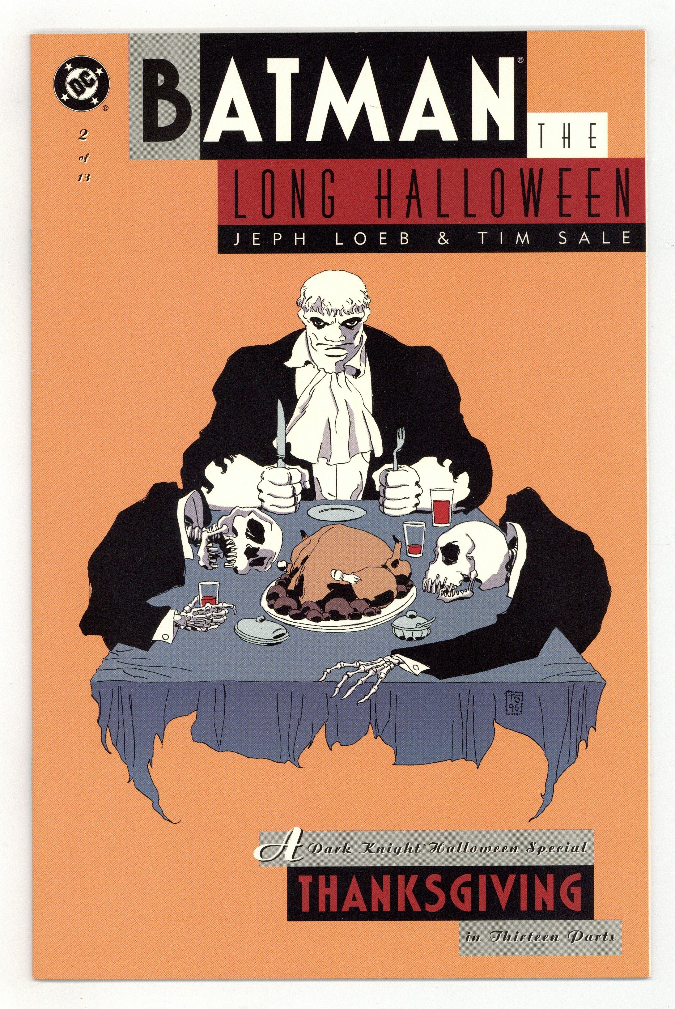 Starts Mar 9 "Thanksgiving." Batman tries to figure out who planted a nail-enhanced bomb in Harvey Dent's house. Includes appearance by Solomon Grundy. Script by Jeph Loeb, art and cover by Tim Sale. Cover price $2.95. Grade: VF- 7.5 explanation of grade Condition: Used (collectible)