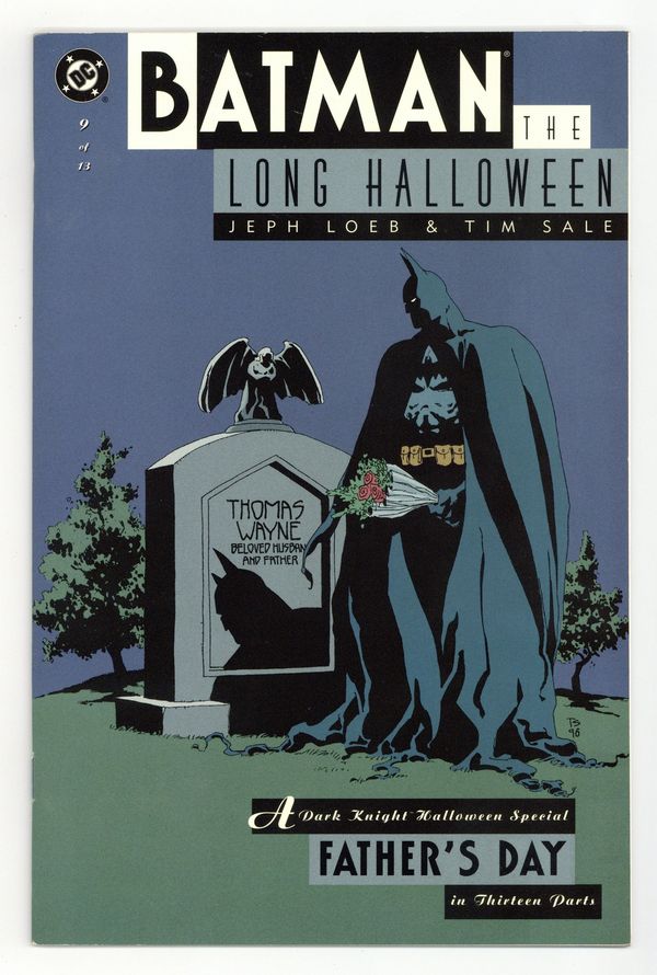 Starts Mar 9 "Father's Day." Bruce Wayne's connections to the Falcone family put the millionaire playboy on trial. Holiday kills again. The Mad Hatter and Scarecrow guest star. Script by Jeph Loeb, art and cover by Tim Sale. Cover price $2.95. Grade: VF- 7.5 explanation of grade Condition: Used (collectible)