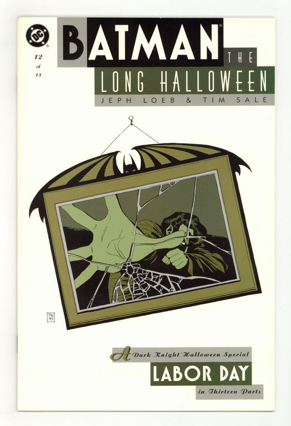 Starts Mar 9 "Labor Day." Holiday goes after Boss Maroni, while Two-Face meets Solomon Grundy. Further evidence revealing the true identity of Holiday is given. Script by Jeph Loeb, art and cover by Tim Sale. Cover price $2.95. Grade: VF/NM 9.0 explanation of grade Condition: Used (collectible)