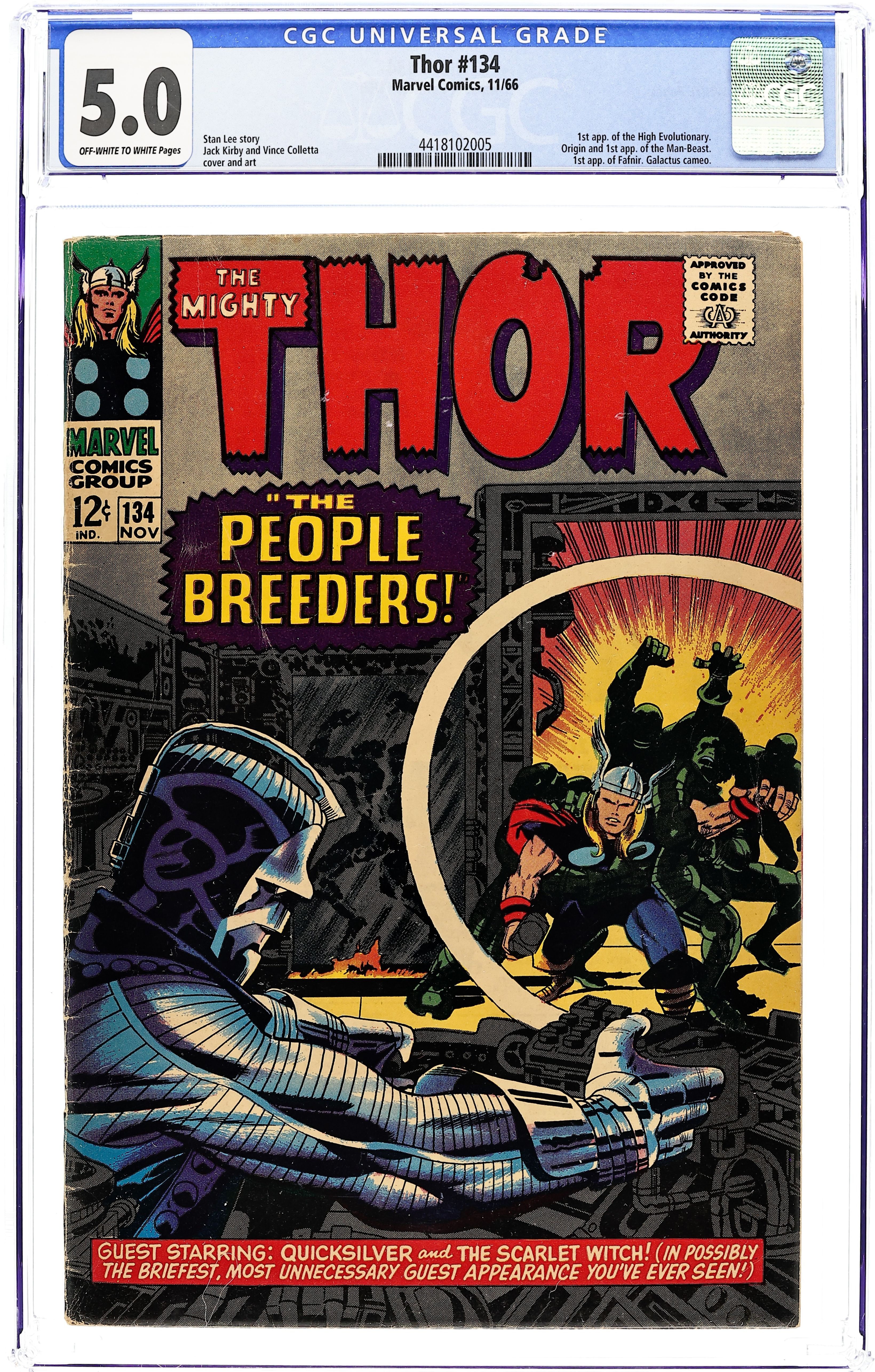 Starts Mar 9 Cover pencils by Jack Kirby, inks by Vince Colletta. First appearances by the High Evolutionary and the Man-Beast in "The People-Breeders!", script by Stan Lee, pencils by Jack Kirby, inks by Vince Colletta; Appearances by Quicksilver, the Scarlet Witch, the Recorder, and Jane Foster; Galactus cameo. Tale of Asgard: "When Speaks the Dragon!", script by Stan Lee, pencils by Jack Kirby, inks by Vince Colletta; Thor and companions inspect Nastrond for Odin. Volstagg wanders off and finds Fafnir. Marvel Super-Heroes Are On TV! ad. 36 pgs., full color. $0.12. Cover price $0.12. Grade: CGC 5.0 explanation of grade Condition: Used (collectible)