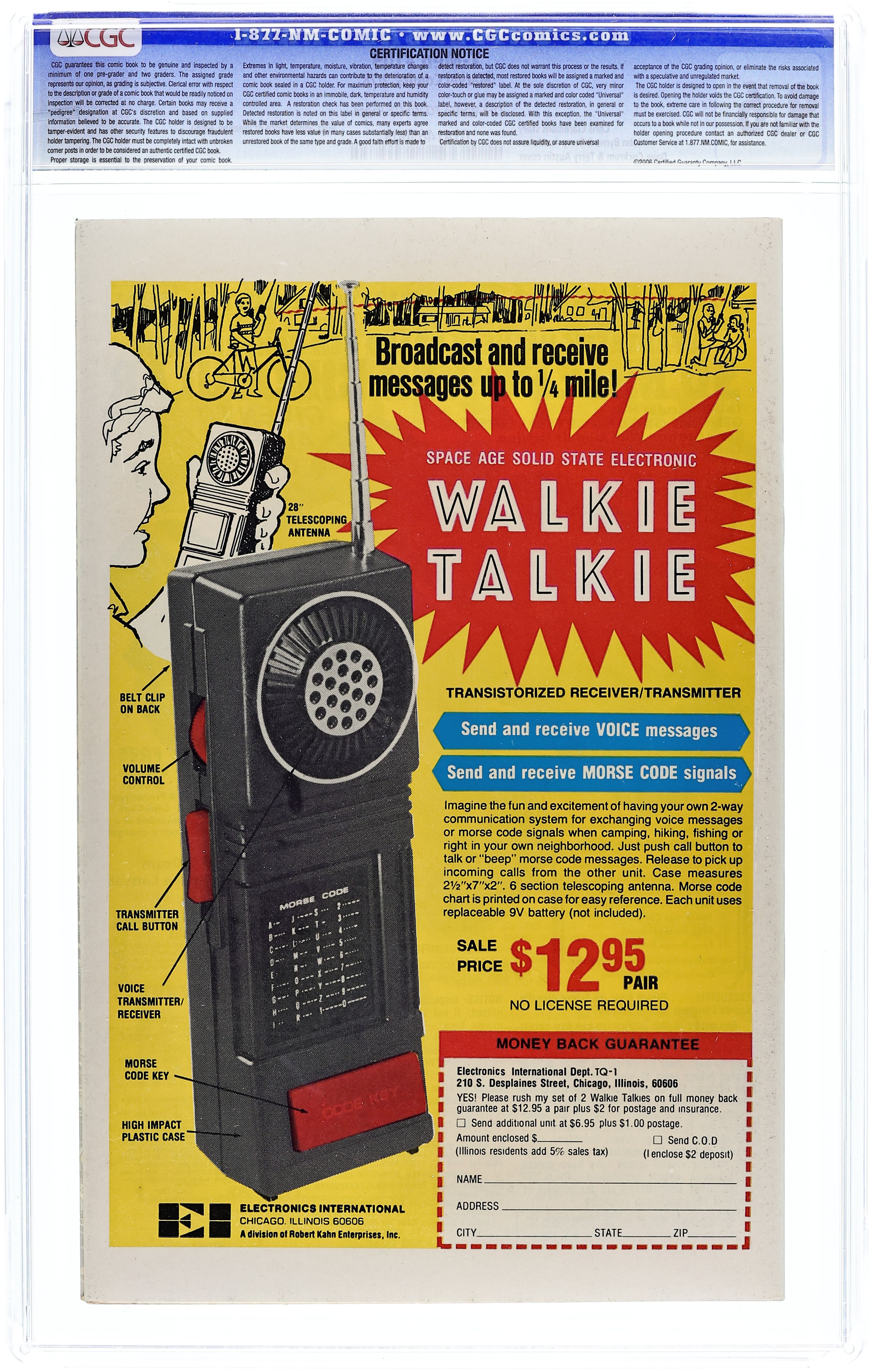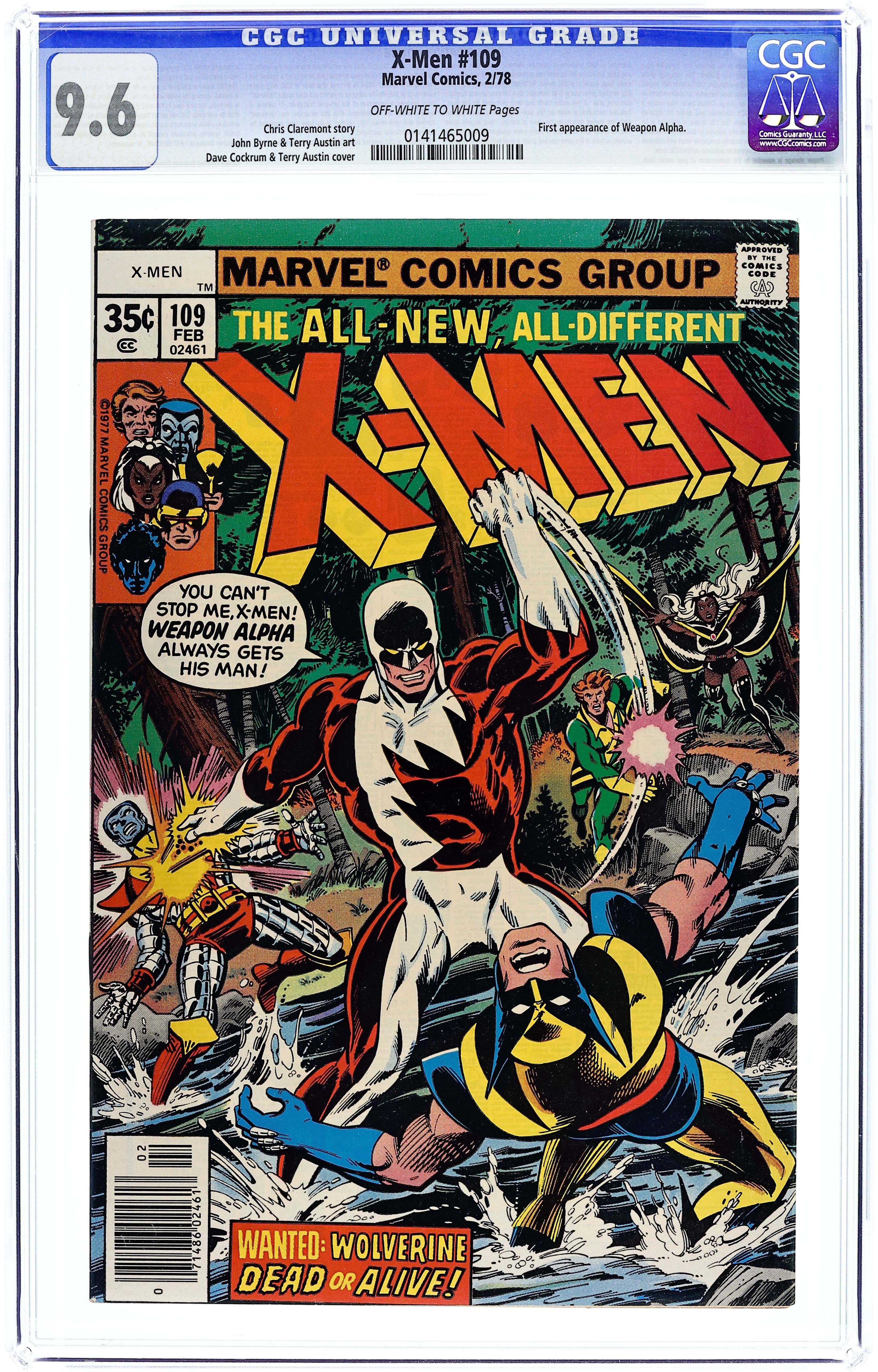 "Home are the Heroes!" Guest-starring Vindicator (1st appearance). Story by Chris Claremont. Art by John Byrne and Terry Austin. Wolverine's past comes back to haunt him. The Canadian Government sends a super-agent to bring back the awol mutant. When the super-powered Vindicator arrives at Xavier's institute, Wolverine finds himself in the battle of his life against a man that was once his friend, and the X-Men are stuck in the middle. 36 pgs. Cover price $0.35. Grade: CGC 9.6 explanation of grade Condition: Used (collectible)