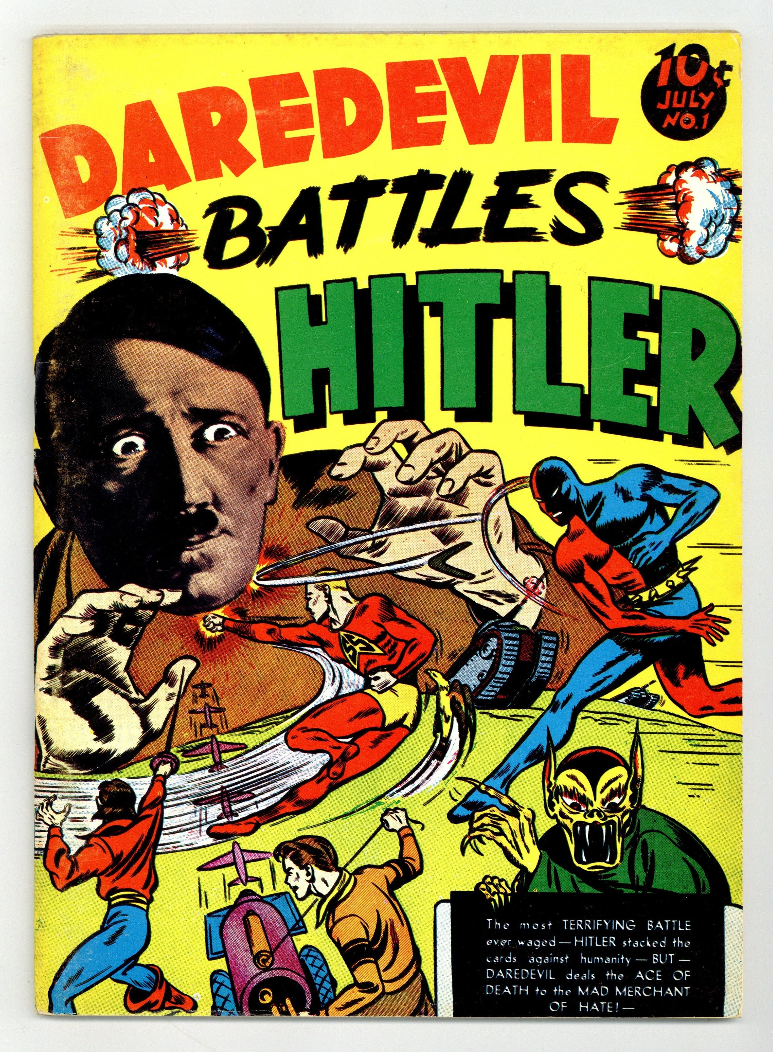 The first issue of the Flashback reprint series presents Daredevil Battles Hitler #1 originally published in 1941 by Lev Gleason. Cover pencils by Charles Biro, inks by Bob Wood; Daredevil crashes in on a meeting at Berchtesgaden in which Hitler makes final plans to invade England across the Channel, then has to evade Nazi soldiers seeking to locate and kill him; Meanwhile, British Prime Minister Churchill meets with Daredevil and the Silver Streak and assigns them to watch a mysterious cottage on the Downs, which leads to an all-out naval battle with the enemy. The Claw Double Crosses Hitler, script by Charles Biro, art by Jack Cole; Hitler approaches the Claw to ask his assistance in helping him and the Japanese successfully attack and destroy the British in Singapore; Daredevil poses as a lieutenant of the Claw to get behind enemy lines to stop the attack. Fighting Hitler and His Jungle Hordes; Daredevil and Lance must stop Hitler's plans to conquer Africa from within, aimed at cutting Great Britain off from her colonial empire. The Case of the Secret Code Machine, script by Charles Biro, art by Jack Cole; Dickie is summoned to Washington D.C. with his latest invention: a fool-proof decoding machine; Unfortunately, it is stolen by several Nazi agents, who try and rush it back to Berlin before Dean, Todd and Daredevil can stop them. "Wreck Goering's Sky-Fighters"; Daredevil and Cloud help fight off the murderous Nazi air blitzkrieg with the help of the RAF, including stopping the Nazi Reichsmarshall, who accepts Cloud's proposal to battle it out with each other in the air. "Von Roeder Nazi Sea Raider" starring Daredevil and The Pirate Prince, art by Harry Anderson; vs. Hitler and Admiral Roeder. "The Man of Hate Adolf Hitler - Dictator of Germany," script and art by Bob Davis. 68-pages, full color cardstock covers, 7-3/4-in. x 10-3/8-in. black-and-white interior on white paper stock, saddle-stitched binding. Cover price $3.00. Grade: FN- 5.5 explanation of grade Condition: Used (collectible)
