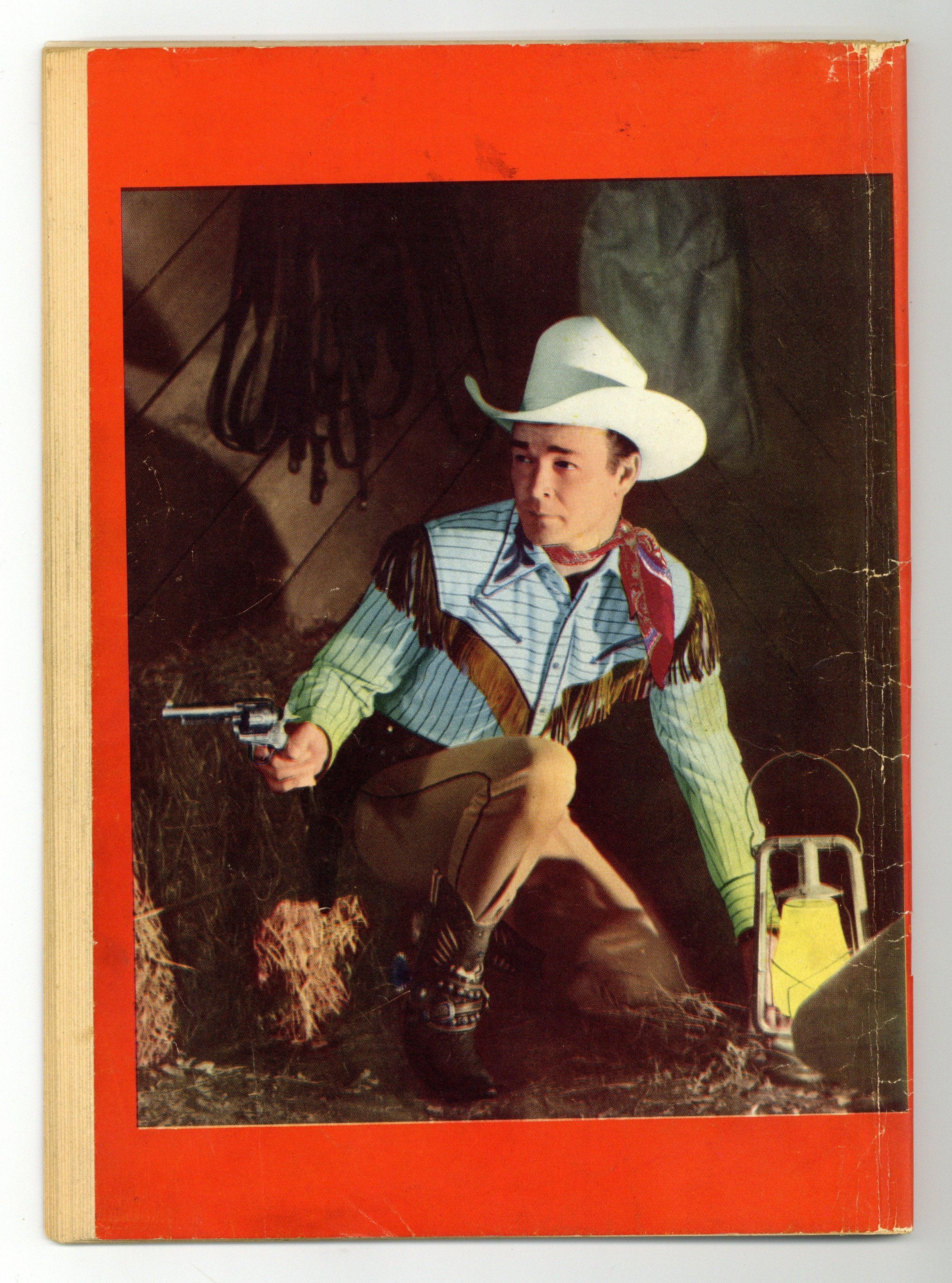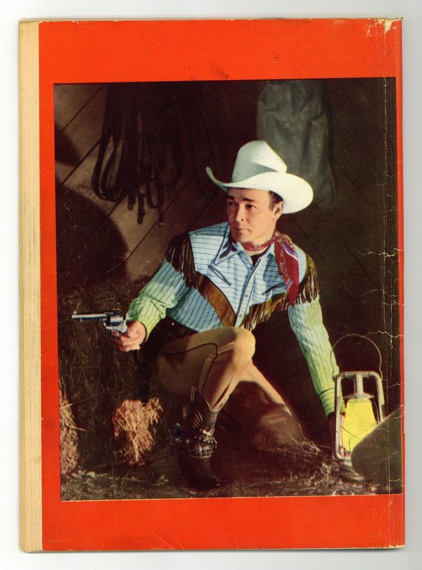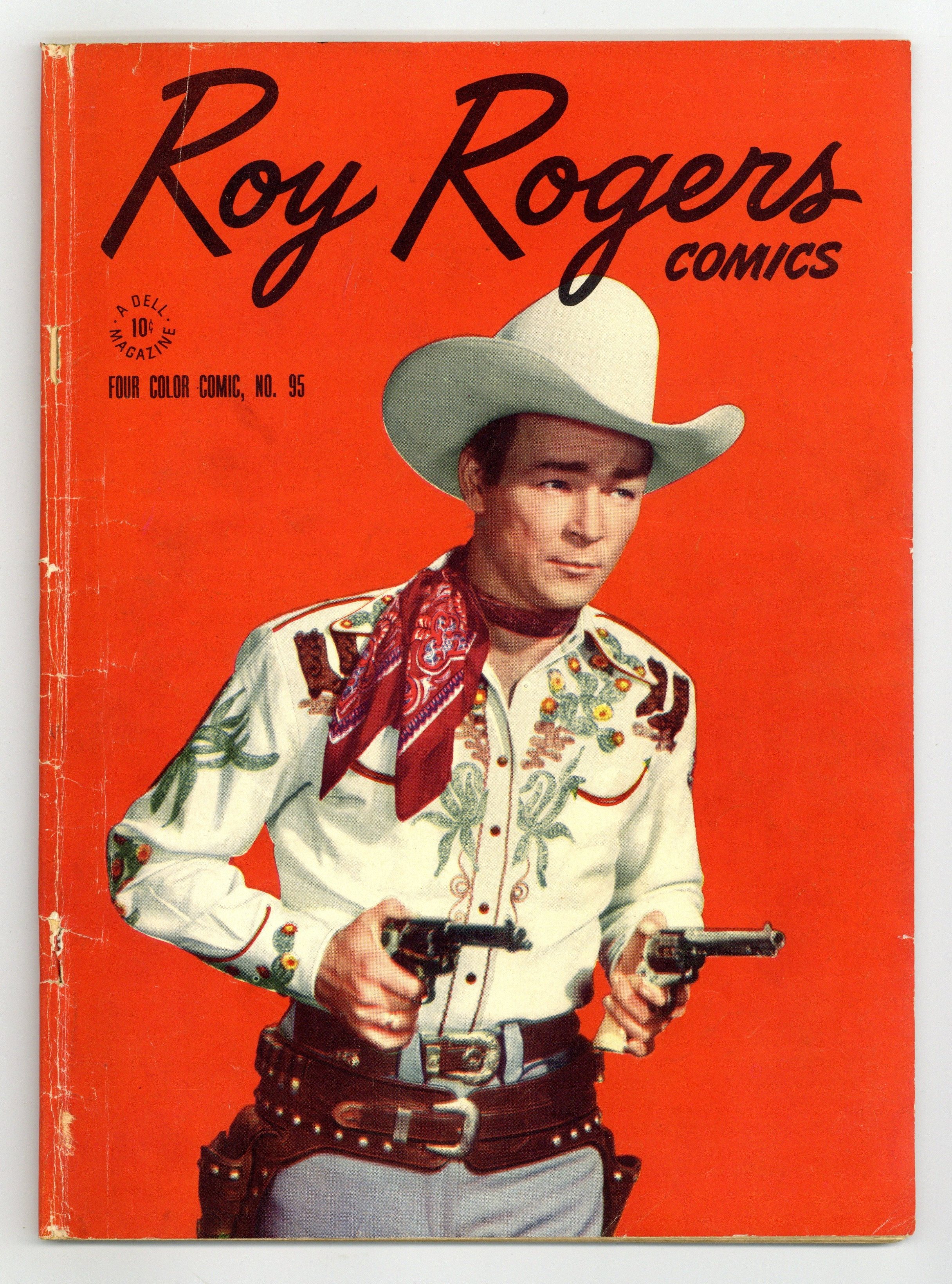 Indicia title is "ROY ROGERS COMICS, No. 95." Roy Rogers photo cover. Publicity photo of Roy sitting on fence on inside front cover. King of the Cowboys, script by Gaylord Du Bois, art by Albert Micale; Roy helps a young lad find his dad's murderer, and comes close to a necktie party himself. Blood in the Badlands, script by Gaylord Du Bois, art by Albert Micale. Publicity photo of Roy sitting on hay bale, playing guitar on inside back cover. Roy in barn, gun drawn, tinted posed photo on back cover. 52 pages, full color. Cover price $0.10. Grade: GD+ 2.5 explanation of grade Condition: Used (collectible)