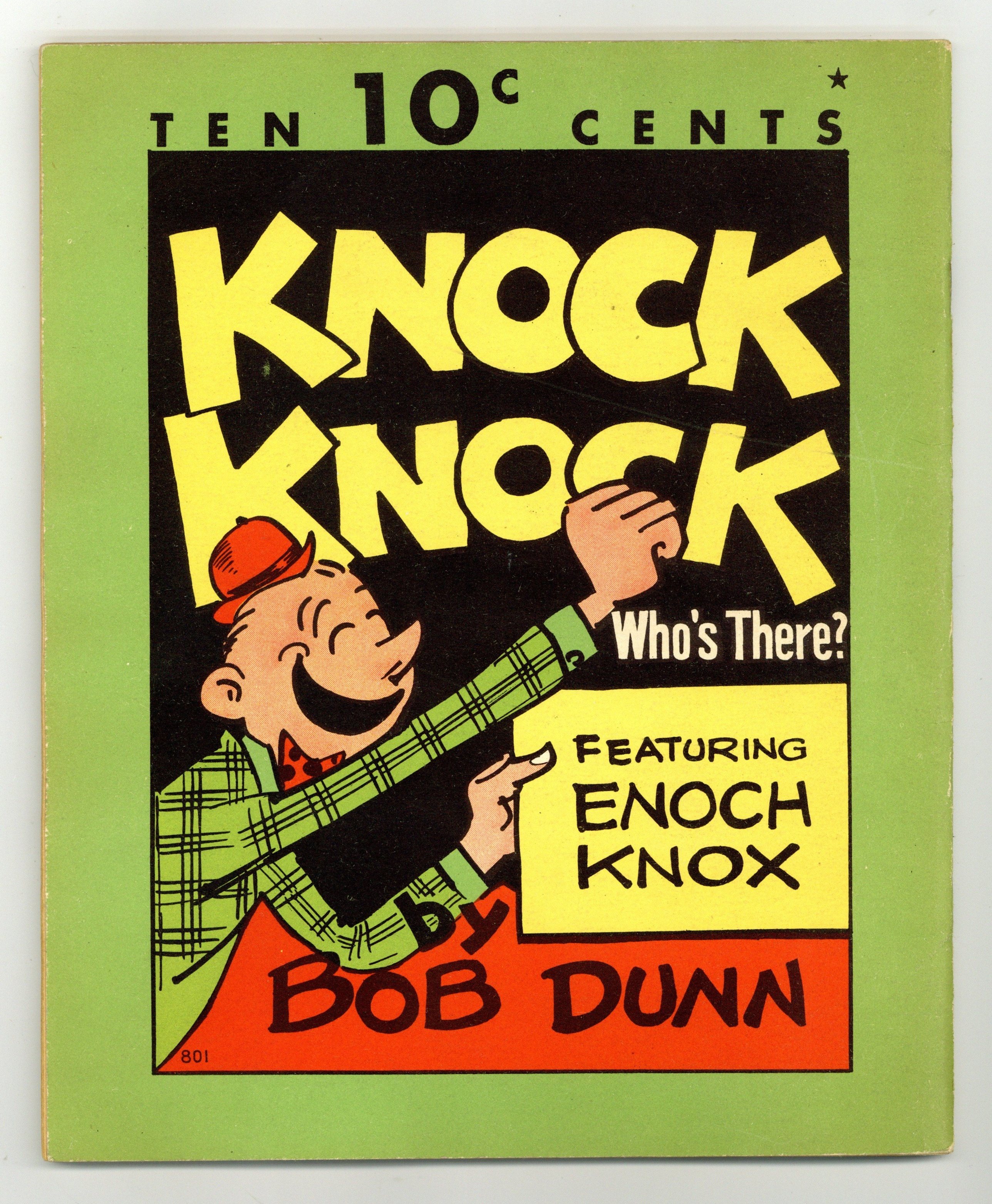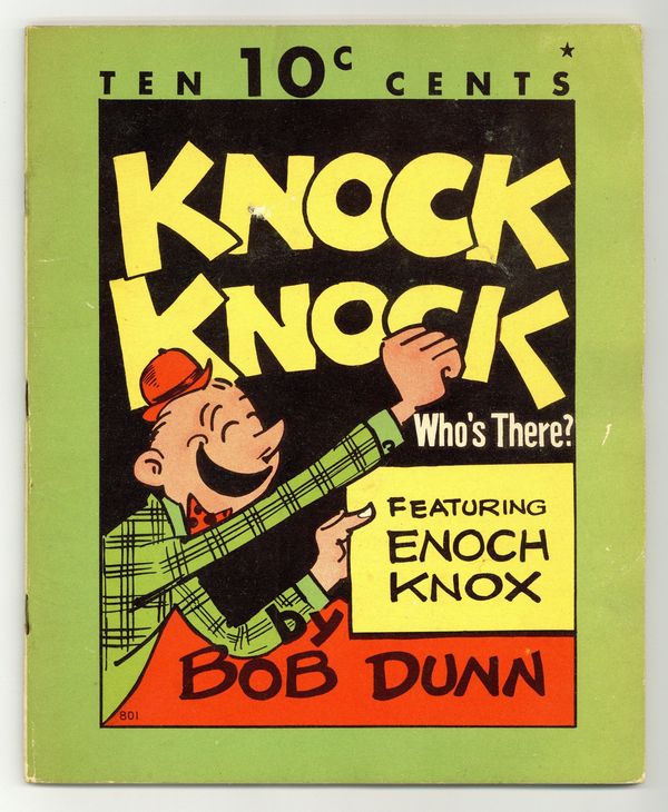 Starts Mar 9 Cover price variant, reads "TEN 10c CENTS" at top of cover. Knock Knock! (1936) featuring Enoch Knox was distributed by Whitman Publishing. Art and jokes by Bob Dunn. Features a plethora of knock knock jokes, some funny, others not so much. The true humor lies in the jokes that fall flat, as the cartoon characters suffer a penalty for sub-par humor. While those that seem to be rather humorous get away scot-free. 48 pages, B&W, card stock cover, 7.5-in. x 9.5-in. Cover price $0.10. Grade: VG 4.0 explanation of grade Condition: Used (collectible)