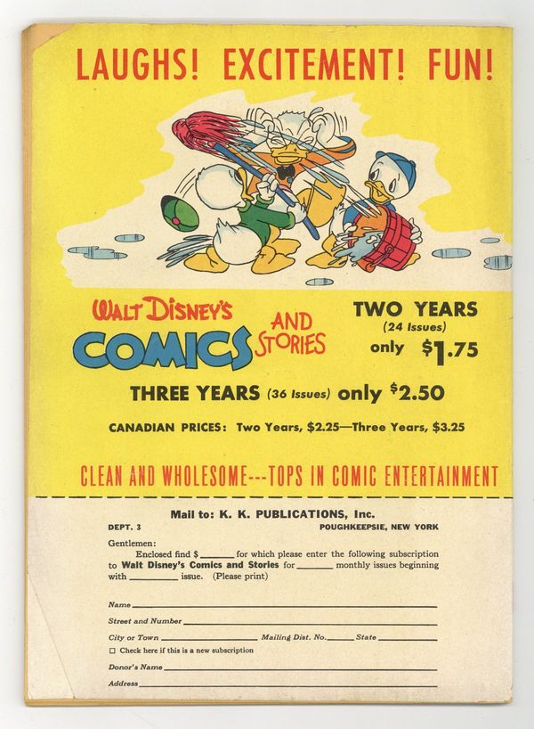 Cover by Walt Kelly. Stories and art by Carl Barks, Floyd Gottfredson, Dick Shaw, Bob Karp, Hubie Karp, Carl Buettner, George Waiss, Don Gunn, Bill Wright, Sylvia Holland, and Al Taliaferro. Sometimes listed as Vol. 6 #6. The long-running vehicle for Disney character comics featured work by Carl Barks, Floyd Gottfredson, and Pogo's Walt Kelly. In a classic story from the Mickey Mouse comic strip, Mickey goes West and gets mistaken for a gunslinger who looks just like him. In a story by Barks, Donald goes ice-fishing and meets his match. Goofy thinks his car has been stolen because his garage is empty. Infinity cover by Kelly. Donald Duck; Bucky Bug; Li'l Bad Wolf; Mickey Mouse; Pluto: In Dutch; Donald's Double Trouble; The Kite Fliers; Mickey Mouse: Billy the Mouse. 48 pages, Full Color. Cover price $0.10. Grade: VG- 3.5 explanation of grade Condition: Used (collectible)