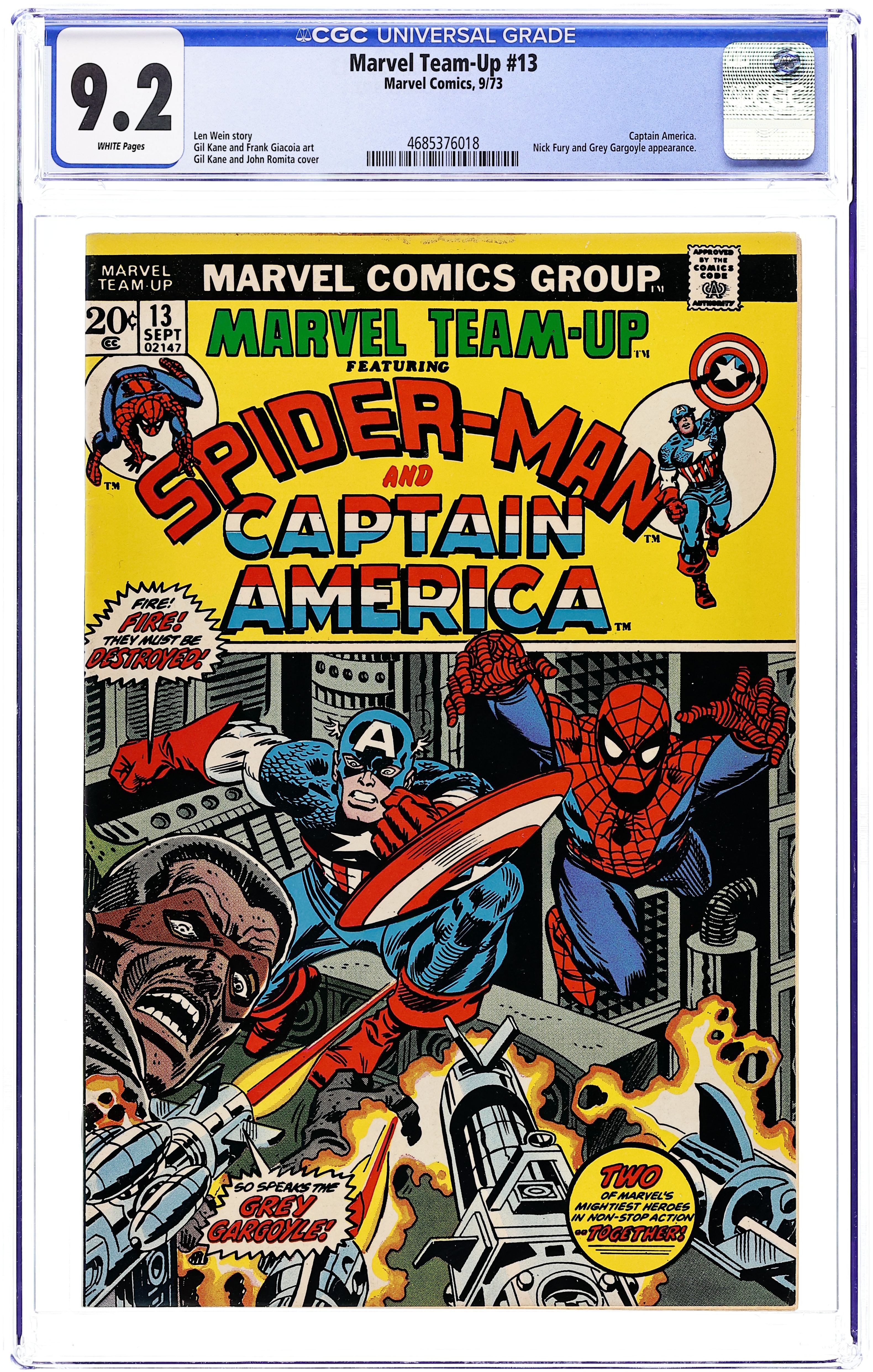 Spider-Man and Captain America star in "The Granite Sky!" Script by Len Wein. Pencils by Gil Kane. Inks by Frank Giacoia and Dave Hunt. Cover by Gil Kane and John Romita. The Amazing Spider-Man and Captain America battle A.I.M. and the Grey Gargoyle. Cameo appearances by Nick Fury and Dum Dum Dugan. Flashback cameos by the Falcon and Sharon Carter. (Note: The Grey Gargoyle previously appeared in Captain America 142 and appears next in Thor 257. This issue was reprinted in Marvel Treasury Edition 22.) 36 pages. Cover price $0.20. Grade: CGC 9.2 explanation of grade Condition: Used (collectible)