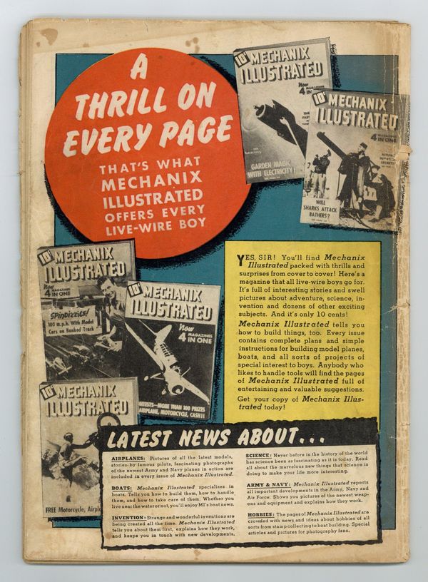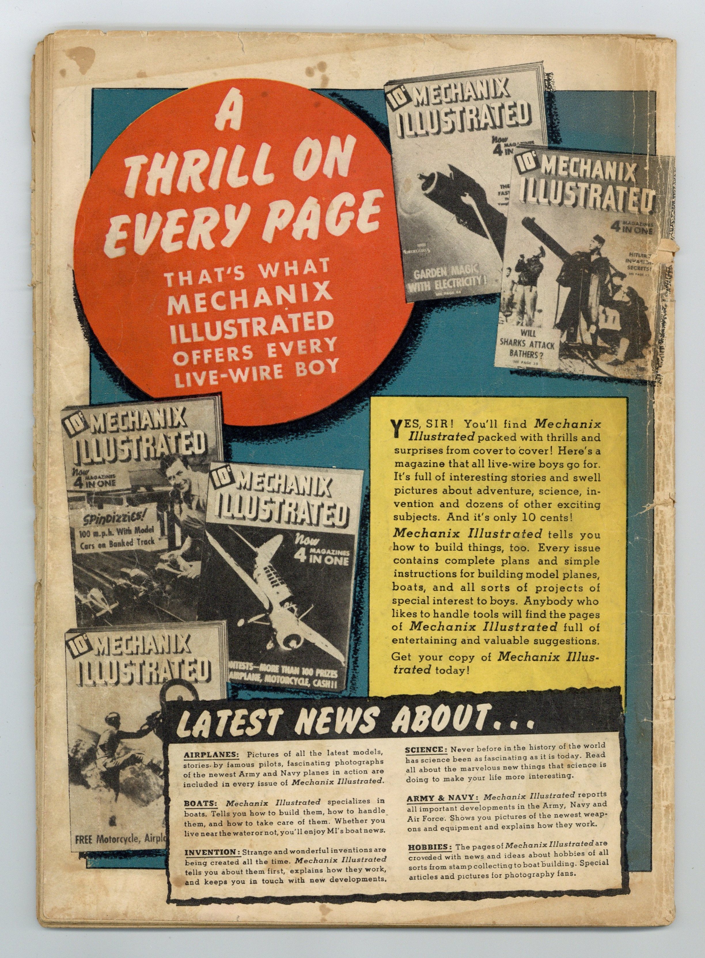 Stories by Charles Sultan, Tom McNamara, and Carl Formes. Cover by Mac Raboy. Susan, Jim and Sgt. Kent attend the theatre one evening, and when the curtain rises, one the actors is discovered dead. Chubby and his pal play truant from school, avoiding the truant officer at every turn, not realizing school is out for the summer! Some crooks decide to heist the prize Ruby of Ankor, but a dying guard reveals that the ruby and other gems from Ankor were stolen by a limping mummy. A convicted murderer vows death to the judge and members of the jury after his conviction, and his escape from the courtroom worries Bulletman enough to look into the matter. Brute Morgan is tired of other racketeers muscling in on his territory, so he decides to get even with them. Ad for Wow Comics #3 and Captain Marvel Adventures #3. Ad from the publisher for their feature characters in Whiz and Master Comics. 68 Pages, Full Color. Cover price $0.10. Grade: FR 1.0 explanation of grade Condition: Used (collectible)