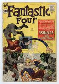 Last 10-cent issue. Cover pencils by Jack Kirby, inks by George Klein. The Skrulls make their first appearance in "The Fantastic Four Meet the Skrulls From Outer Space!", script by Stan Lee, pencils by Jack Kirby, inks by George Klein; Four shape-changing Skrulls pose as the Fantastic Four and act as criminals while the true ones are in the country and recall their origin. Part 2 Prisoner of the Skrulls; The real FF is imprisoned by the government for their criminal acts; They escape and decide to flush out the imitating Skrulls. The Fantastic Four Fight Back!, script by Stan Lee, pencils by Jack Kirby, inks by George Klein. Thing pin-up by Kirby, inks by Klein. The Fantastic Four... Captured!, script by Stan Lee, pencils by Jack Kirby, inks by George Klein; The four Skrull spies are captured, forced to take on the form of cows and then hypnotized to forget all of their former lives. NOTE: This volume holds key clues to the Secret Invasion. 36 pgs. $0.10. Cover price $0.10. Grade: FR 1.0 explanation of grade Condition: Used (collectible)