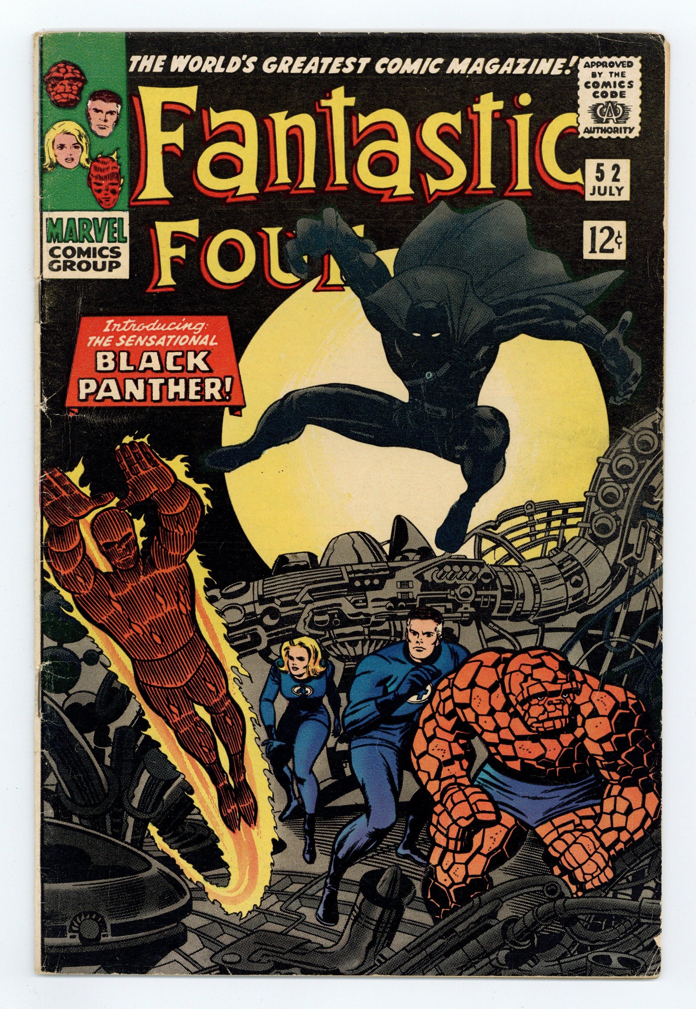 Cover pencils by Jack Kirby, inks by Joe Sinnott. First appearance of the Black Panther in The Black Panther!, script by Stan Lee, pencils by Jack Kirby, inks by Joe Sinnott; The Black Panther invites the FF to Wakanda and demonstrates his powers by attacking them. 36 pgs. Cover price $0.12. Grade: VG 4.0 explanation of grade Condition: Used (collectible)