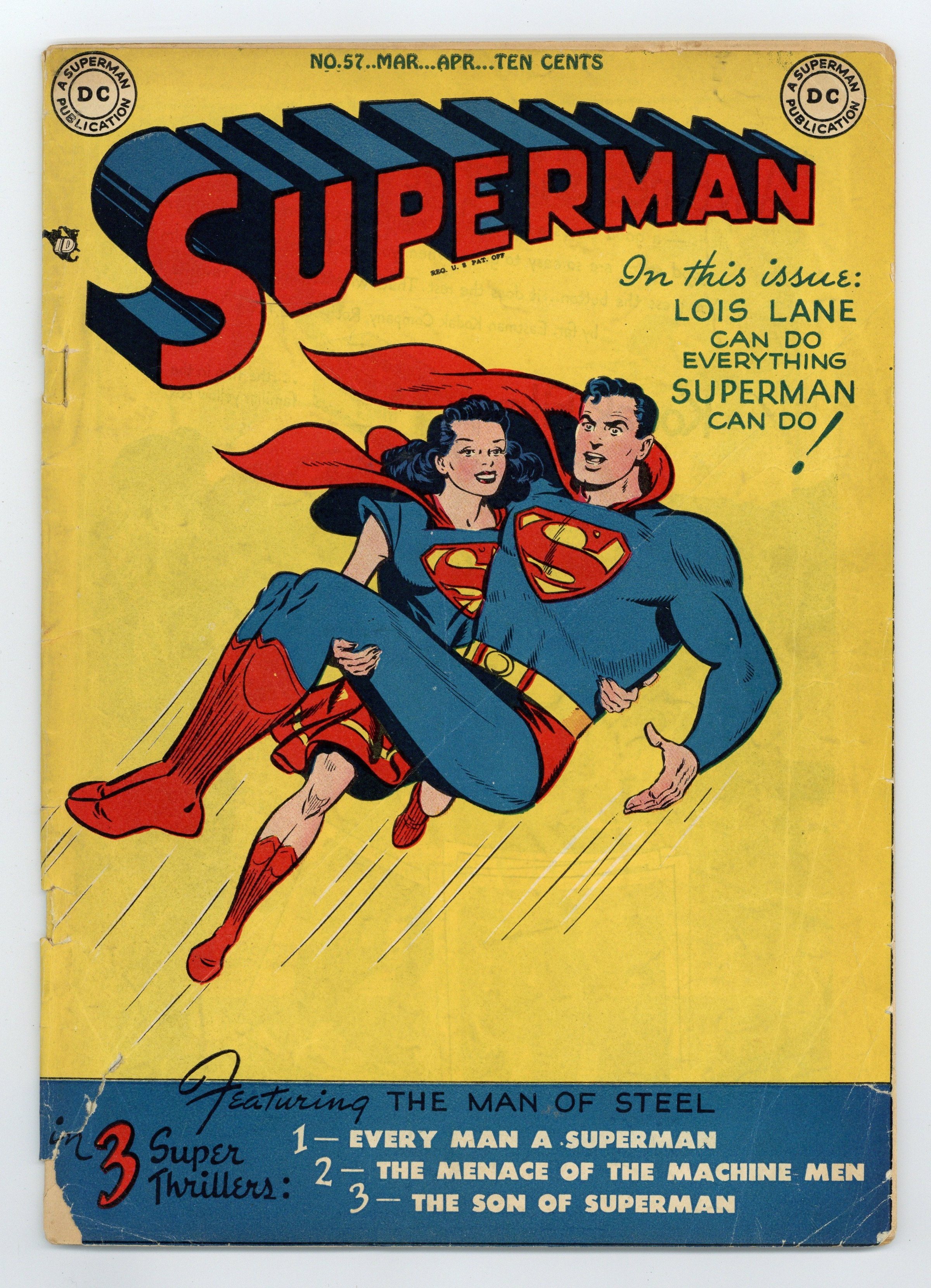 Cover pencils by Wayne Boring, inks by Stan Kaye. The Menace of the Machine Men, script by Edmond Hamilton, pencils by Wayne Boring, inks by Stan Kaye; Aliens appear to land in the woods outside Northville and invade the city with giant robots. Every Man a Superman, script by William Woolfolk, pencils by Wayne Boring, inks by Stan Kaye; Superman is thrown into the future where everyone has super powers, and he meets a woman who looks just like Lois Lane. Bebe humor two-pager by Henry Boltinoff. Beethoven bio. Varsity Vic humor page by Henry Boltinoff. The Son of Superman, pencils by Wayne Boring, inks by Stan Kaye; Superman adopts an orphan boy and builds up his strength and confidence. Full-page ad for Superboy #1. 52 Pages, Full Color. Cover price $0.10. Grade: GD 2.0 explanation of grade Condition: Used (collectible)