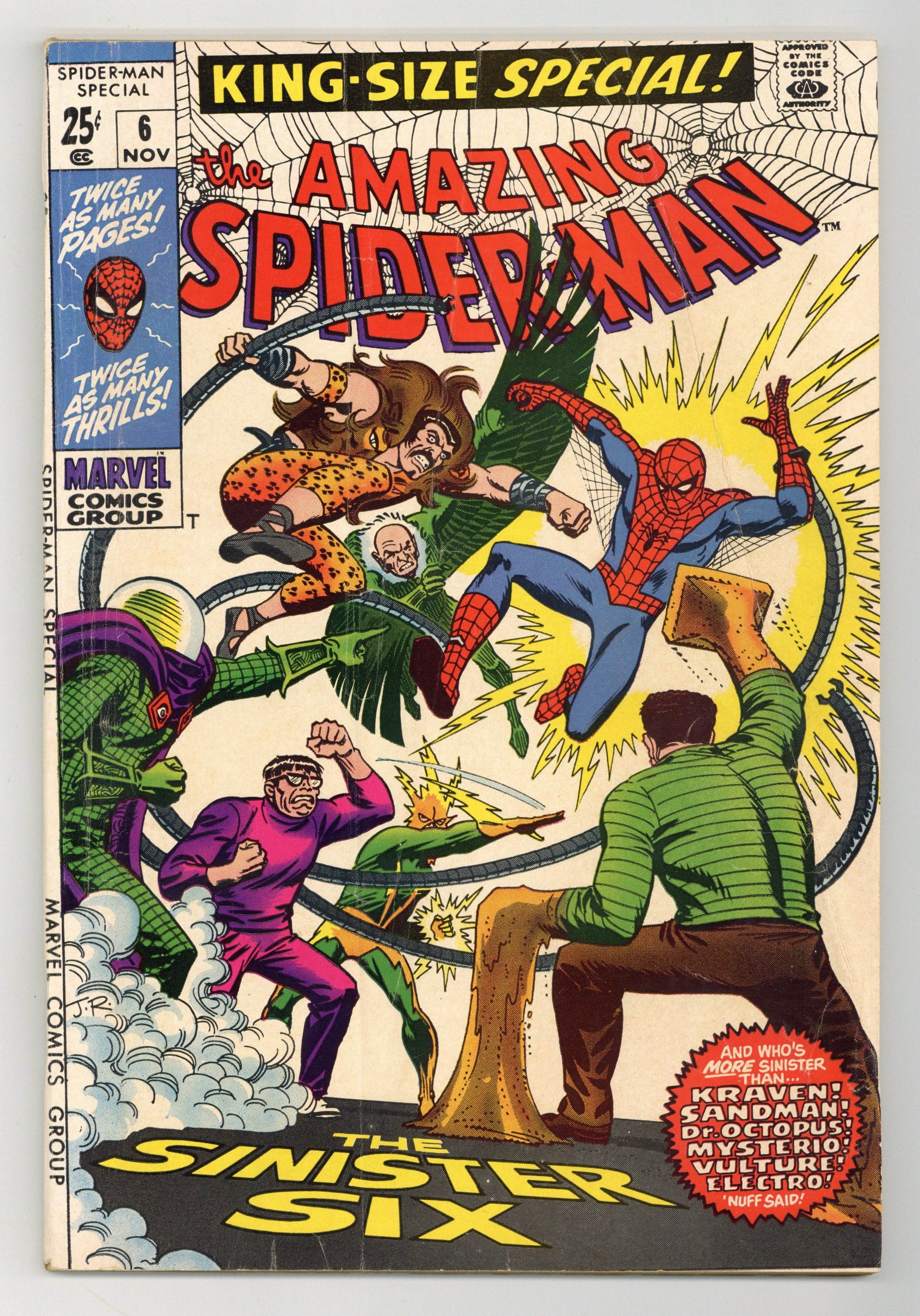 Starts Mar 2 This annual features three reprint stories and a new cover by John Romita. First story reprinted from Amazing Spider-Man Annual 1: "The Sinister Six!" Script by Stan Lee. Art by Steve Ditko. The web-slinger battles the Vulture, Kraven, Mysterio, Electro, Dr. Octopus, and the Sandman to save Aunt May and Betty Brant! Second story reprinted from Fantastic Four Annual 1: "The Fabulous Fantastic Four Meet Spider-Man!" Script by Stan Lee. Pencils by Jack Kirby. Inks by Steve Ditko. This 6-page story expands upon the wall-crawler's first meeting (and fight) with the FF in Amazing Spider-Man 1. Third story reprinted from Amazing Spider-Man 8: "Spider-Man Tackles the Torch!" Guest-starring the Fantastic Four. Script by Stan Lee. Pencils by Jack Kirby. Inks by Steve Ditko. Spidey crashes Johnny's party and creates a ruckus. 25 cent cover price. 68 pgs. Cover price $0.25. Grade: GD+ 2.5 explanation of grade Condition: Used (collectible)