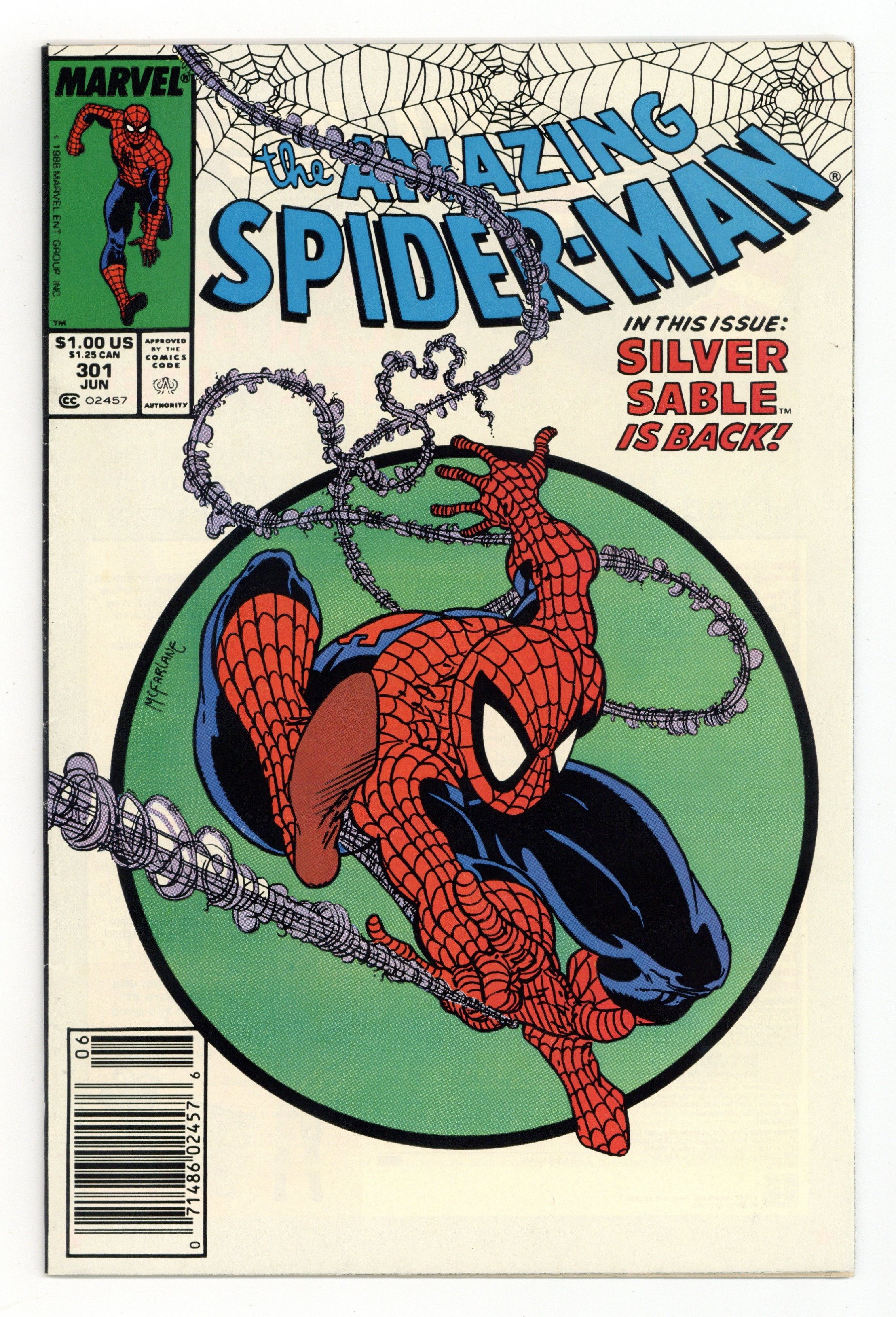 Starts Mar 16 Newsstand Edition. "The Sable Gauntlet!" Guest-starring Silver Sable. Script by David Michelinie. Art by Todd McFarlane. Cover by Todd McFarlane. The first 300 issues of the Amazing Spider-Man are in the books after the web-slinger's epic battle vs. Venom last issue! And now the next chapter in the wall-crawler's anthology begins with an encounter with his favorite mercenary: Silver Sable! The enchanting sable agrees to make a test run through the security systems of a new high-rise office building, but deadly danger awaits on the top floor! Will Spidey catch the elevator in time? Cameo appearances by Mary Jane Watson and Dr. Morris Sloan. First $1.00 issue. (Notes: The cover is the same artwork (with different colors) as the cover to issue 300. This issue includes a full-page ad for the first appearance of Typhoid Mary in the Daredevil (1st) series -- art by John Romita Jr. and Al Williamson. The letters page contains a statement of ownership: average print run 469,913; average paid circulation 284,692.) 36 pgs. Cover price $1.00. Grade: FN+ 6.5 explanation of grade Condition: Used (collectible)