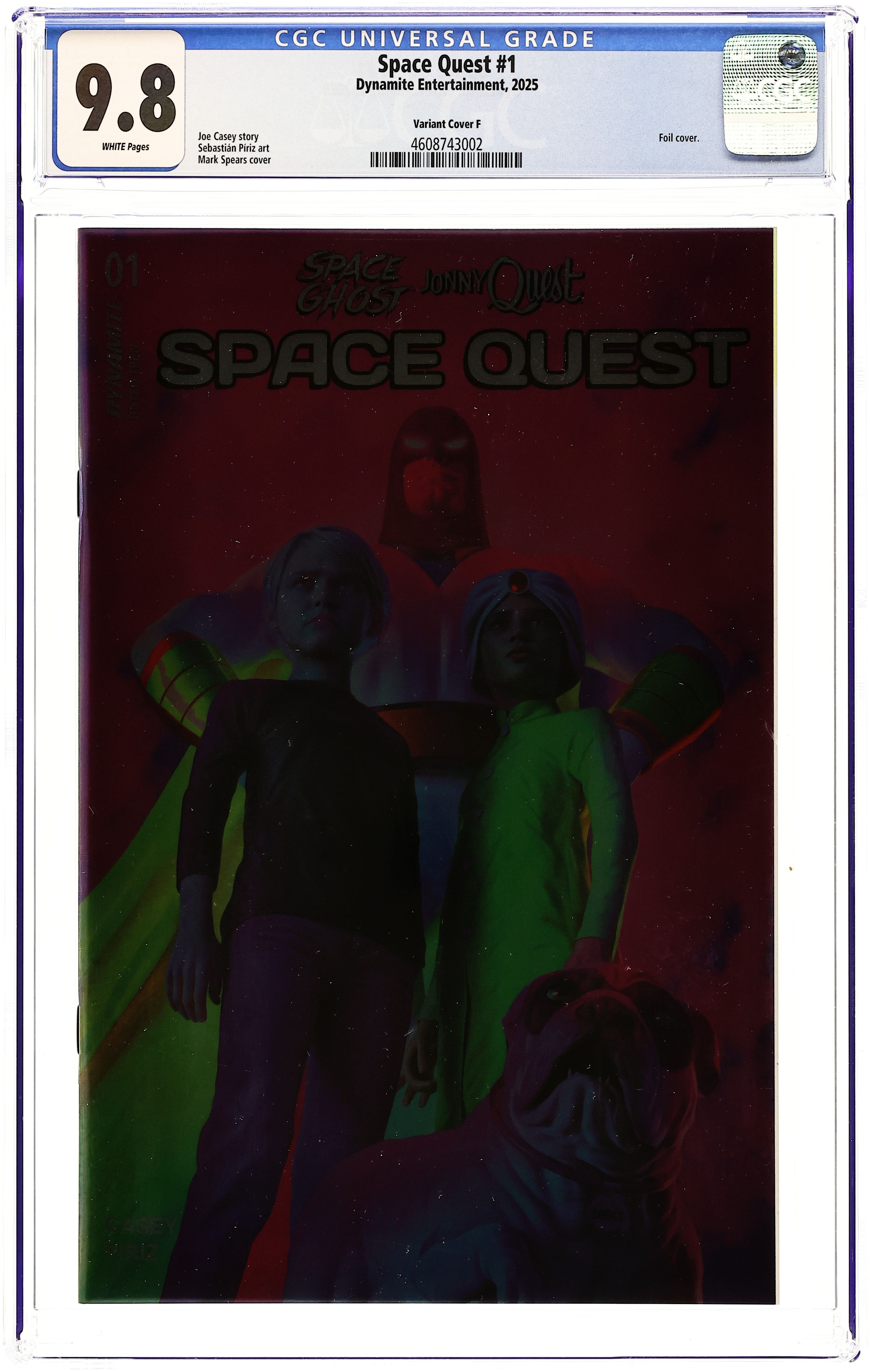 Starts Mar 9 Foil Cover. Written by Joe Casey. Art by Sebastian Piriz. Cover by Mark Spears. At last, the meeting the cosmos demanded! The Quest Family is legendary for how far they'll go in the spirit of exploration and discovery, but now they're headed for outer space! Jonny and the gang are brought in to investigate a mysterious potentially alien spacecraft being held at Area 51. And where there's a spaceship there's bound to be aliens, right? What happens when Space Ghost and Jonny Quest cross paths? The greatest entertainment event of the twenty-first century, that's what! Brought to you by the acclaimed creative team of Jonny Quest! 32 pages, full color. Rated T Cover price $9.99. Grade: CGC 9.8 explanation of grade Condition: Used (collectible) unless item is a new release