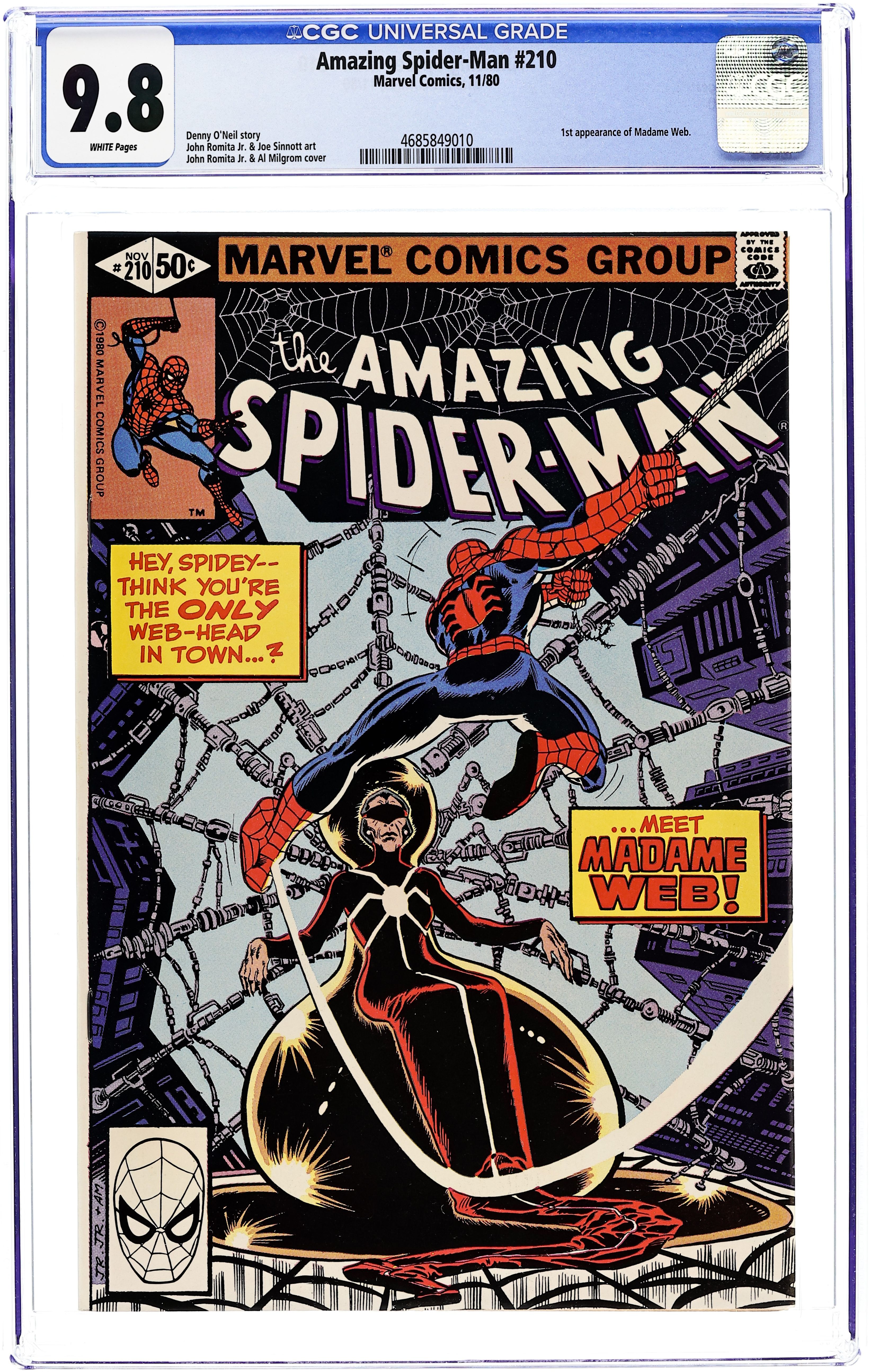 Direct Edition. "The Prophecy of Madame Web!" First appearance of Madame Web. Script by Denny O'Neil. Art by John Romita Jr. (breakdowns) and Joe Sinnott (finishes). Cover by John Romita Jr. and Al Milgrom. Masked gunmen barge into the board room of the Daily Globe and kidnap its publisher K.J. Clayton! Fortunately though, the web-slinger is nearby and gives chase! The wall-crawler doesn't catch the criminals, but he does catch a clue! A mysterious clairvoyant called Madame Web is somehow connected to the victim! After befriending the aging soothsayer and heeding her advice, Spider-Man rushes off to the rescue! Can the web-slinger find the missing publisher and get the Daily Globe back in circulation? Cameo appearance by J. Jonah Jameson. (Notes: Peter Parker ends his employment with the Daily Globe. Madame Web appears next in Amazing Spider-Man 216. John Romita Jr. begins his three-and-a-half year run as the penciler of the Amazing Spider-Man title.) 36 pages, full color. Cover price $0.50. Grade: CGC 9.8 explanation of grade Condition: Used (collectible)