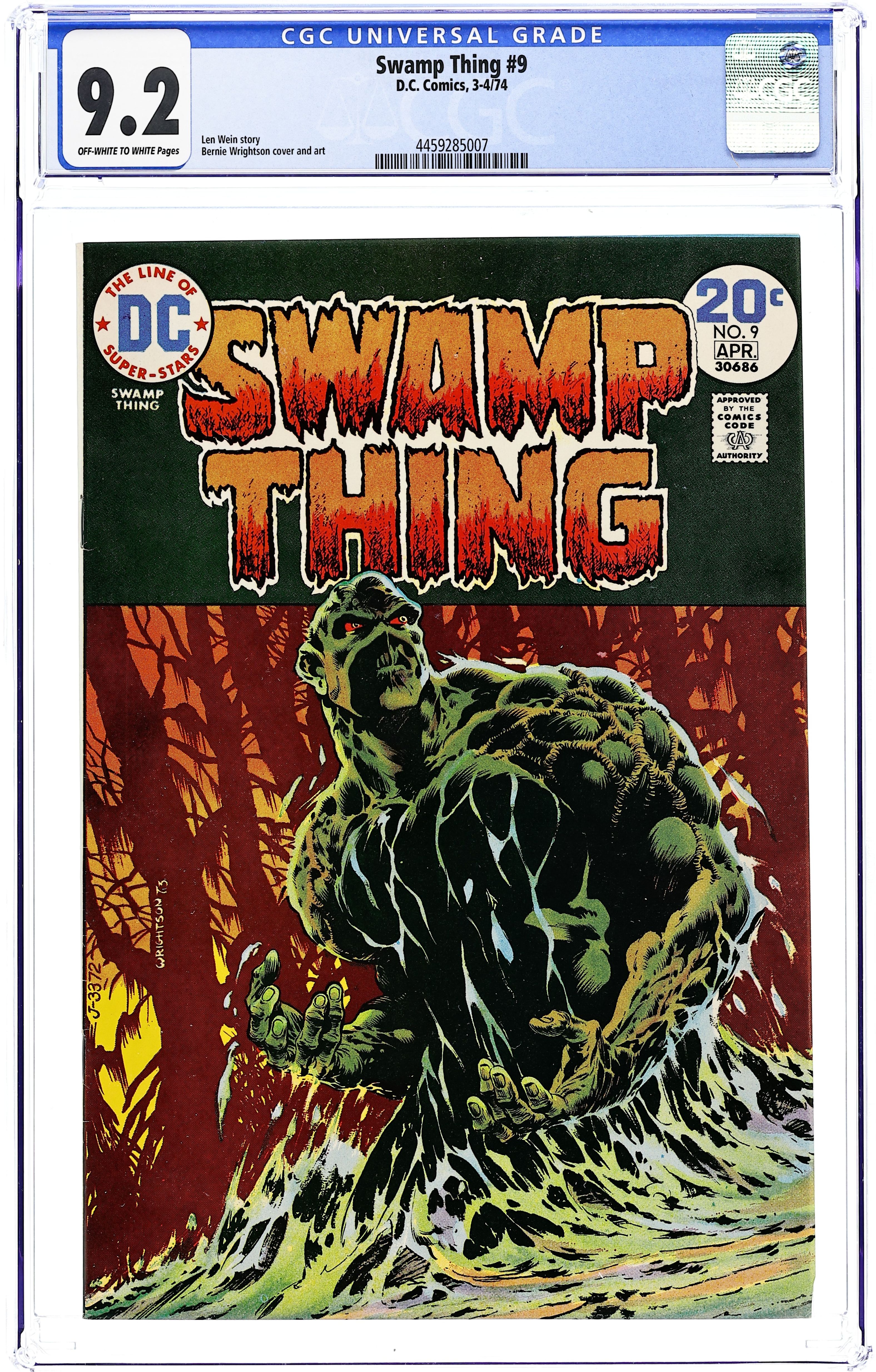 Starts Mar 9 "The Stalker From Beyond." Swamp Thing sneaks aboard a train to the Louisiana swamp where he was "born." However, he is unaware that an alien has landed there to repair its spaceship. Script by Len Wein, pencils by Berni Wrightson, inks by Wrightson and Mike Kaluta. Cover by Wrightson. Cover price $0.20. Grade: CGC 9.2 explanation of grade Condition: Used (collectible)