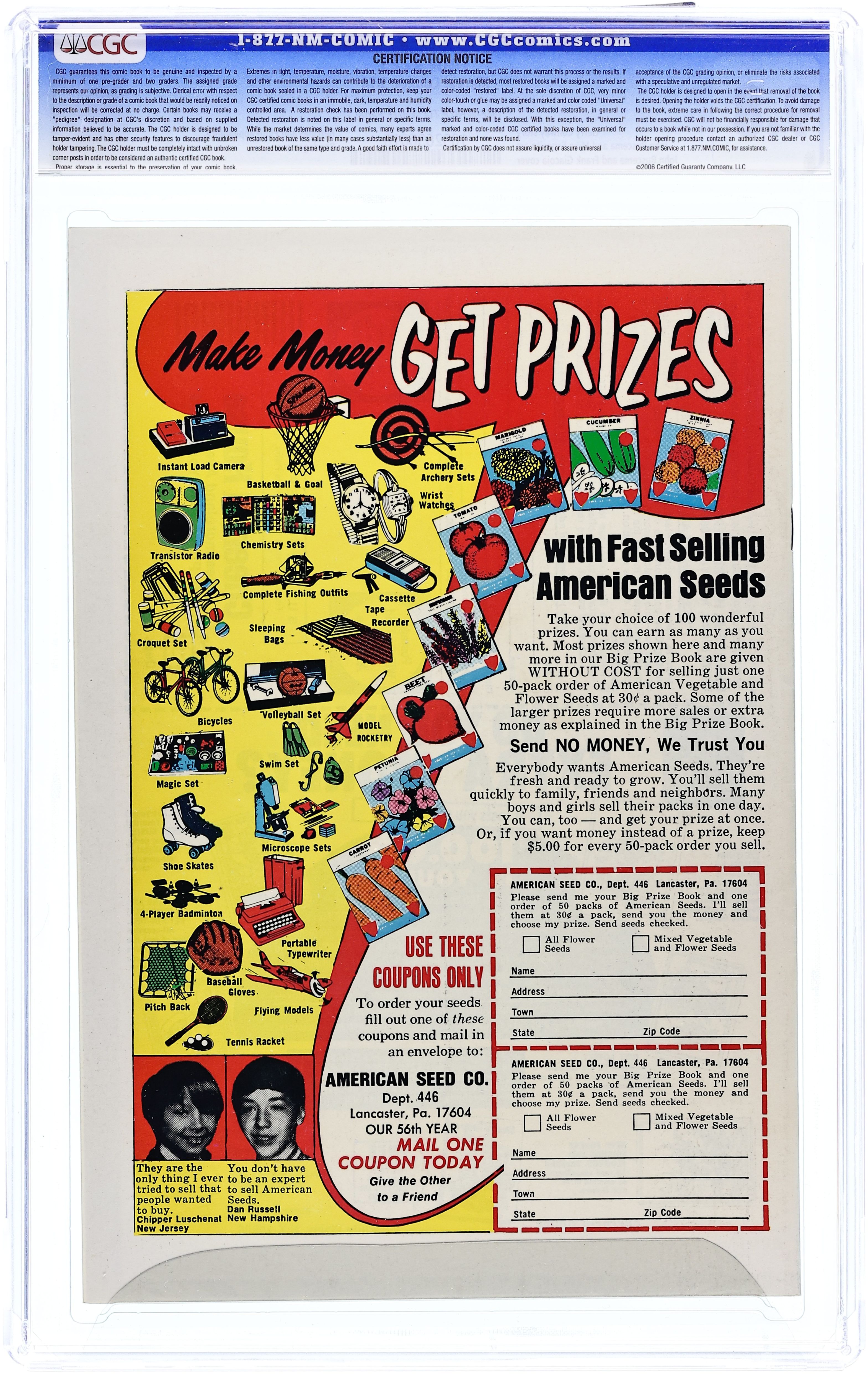 Starts Apr 4 First 25-cent cover price. Cover pencils by Gil Kane, inks by Frank Giacoia. "Hellfire Across the World!", script by Gerry Conway, pencils by John Buscema, inks by Mike Esposito; Thor and Hercules enter Hades and are attacked by demon-bats, and snake women; They fight their way past, only to find that Pluto has fled with Krista; They go to Asgard, where Odin reveals that Pluto has gone to Manhattan; Thor and Hercules follow him there; Thor defeats Pluto and drives him away; He then discovers that Krista is dying, and only Don Blake can save her. Appearances by Sif and Hildegarde. The letters page contains Marvel Value Stamp series A #12 (Daredevil by Jack Kirby), plus a statement of ownership: average print run 405,894; average paid circulation 195,239. 36 pgs., full color. $0.25. Cover price $0.25. Grade: CGC 9.8 explanation of grade Condition: Used (collectible)