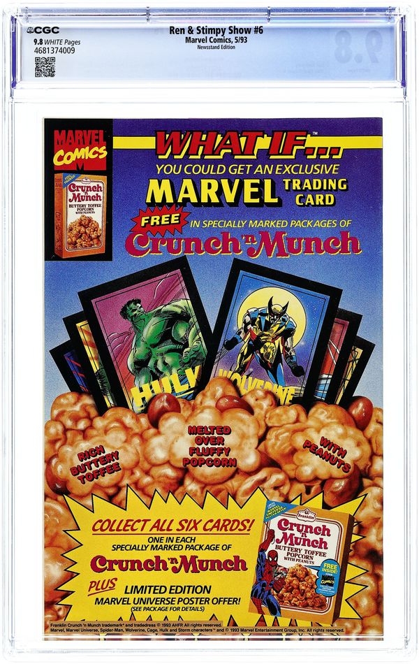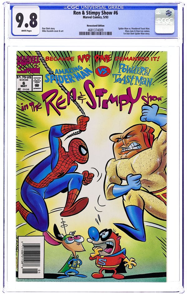 Newsstand Edition. Cover art by Mike Kazaleh. Clash of Titans Break-Fest of Chumpions starring Ren, Stimpy, Spider-Man, and Powdered Toast Man, script by Dan Slott, art by Mike Kazaleh. Untitled Ren and Stimpy story starring Spider-Man, art by Ken Mitchroney. Cover price $1.75. Grade: CGC 9.8 explanation of grade Condition: Used (collectible)
