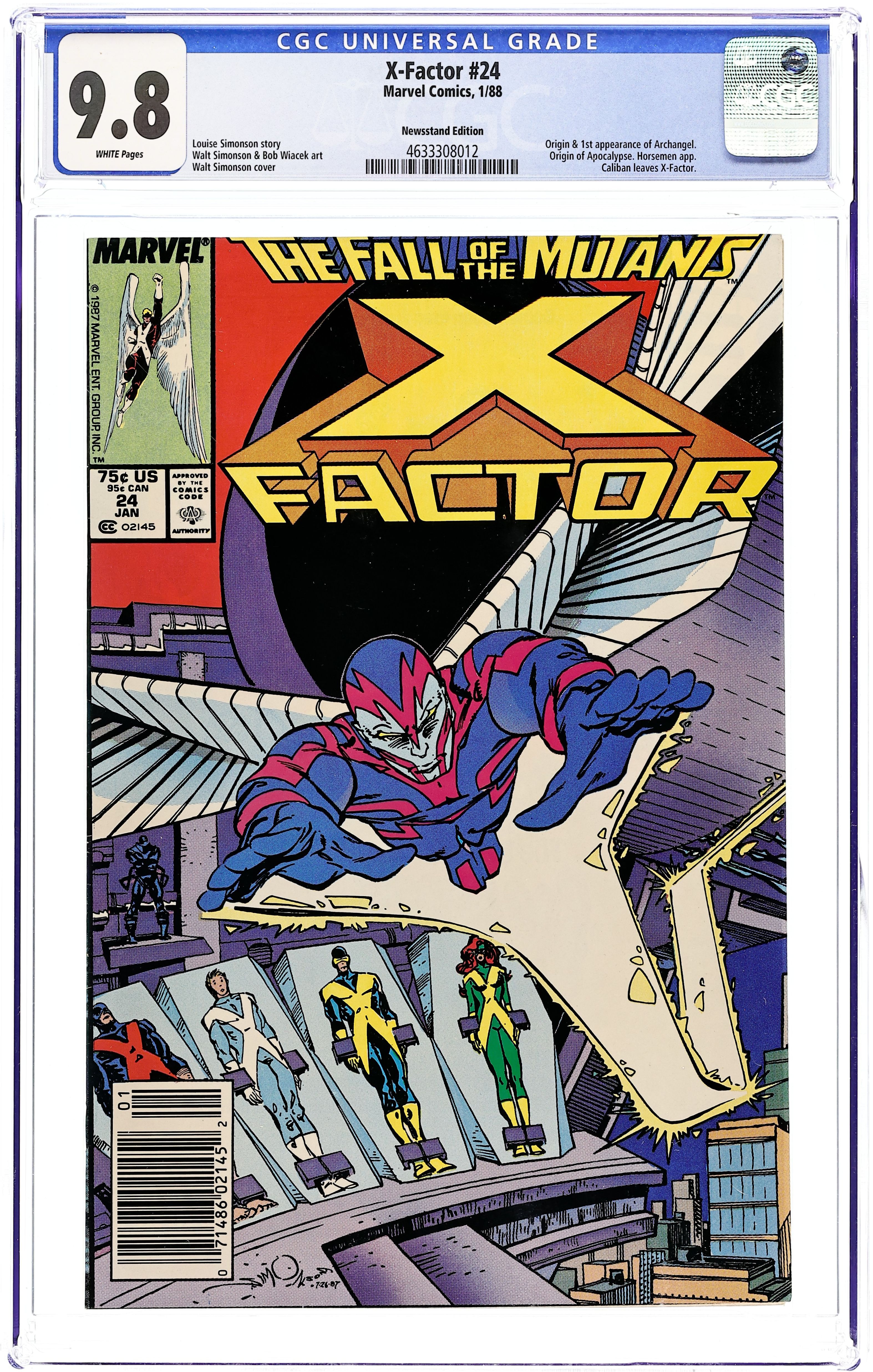 Newsstand Edition. Fall of the Mutants! Part 1 of 3. "Masks!" 1st full appearance of Archangel. Story by Louise Simonson. Art by Walter Simonson and Bob Wiacek. One of the biggest mutant events to ever hit the comic racks begins here. The powerful mutant known as Apocalypse finally makes his move and unleashes his Four Horseman on an unsuspecting world. The only thing standing between humanity and total annihilation is X-Factor. However when the fourth and final Horseman, Death, reveals his true identity, the group will be rocked to its very core. This is a pivotal chapter in the lives of the original X-Men. Cover price $0.75. Grade: CGC 9.8 explanation of grade Condition: Used (collectible)