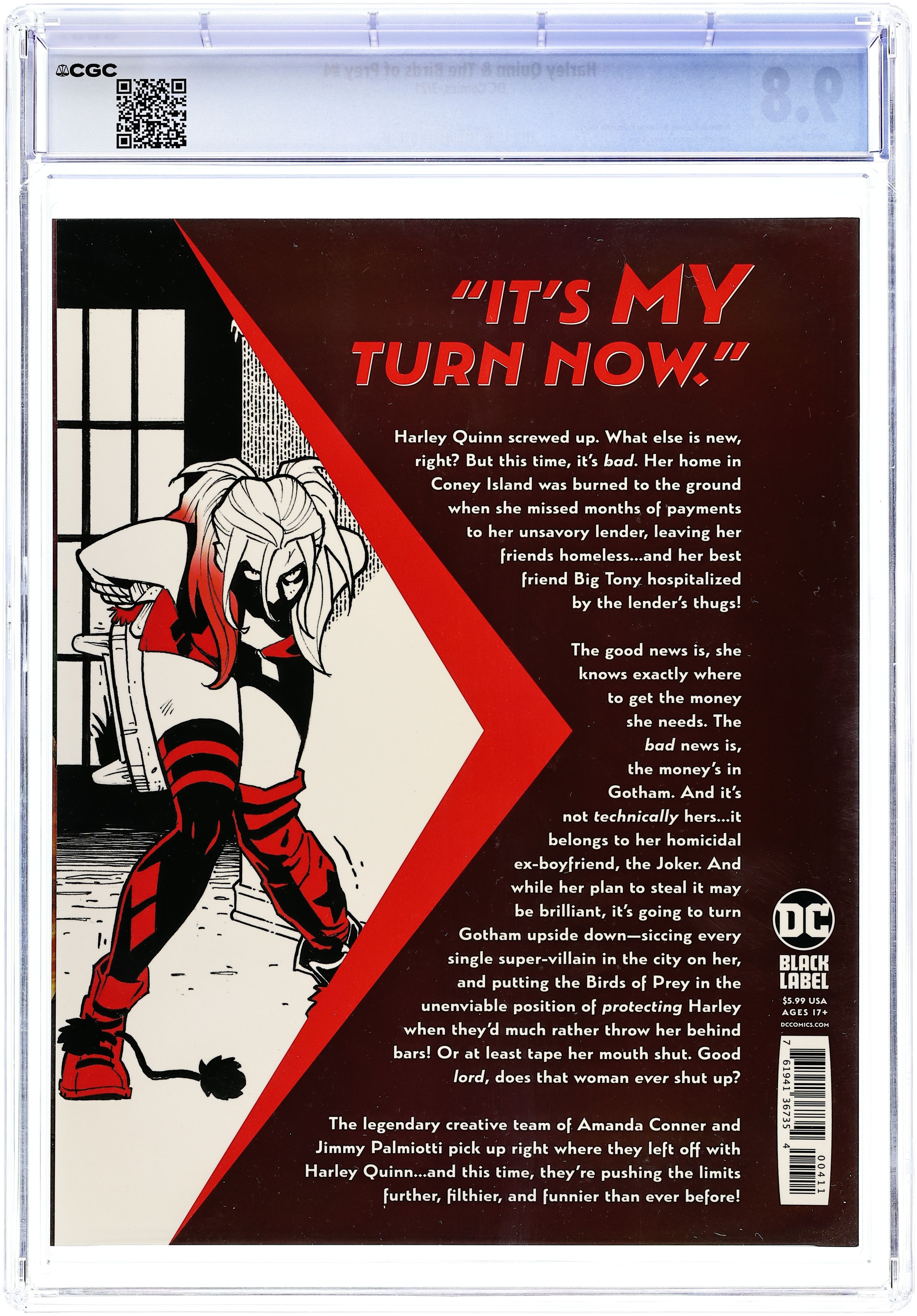 Written by Amanda Conner and Jimmy Palmiotti. Art by Amanda Conner. Cover by Amanda Conner and Alex Sinclair. There was no way Harley was going to make it out of Gotham City without coming face to face with The Joker…and just as shes taken all his money, hes determined to take something that means even more to her! This will be the most harrowing gauntlet of Harleys life, and she—and you—are not ready for it! 30 pages, full color. Ages 17+ Cover price $5.99. Grade: CGC 9.8 explanation of grade Condition: Used (collectible)