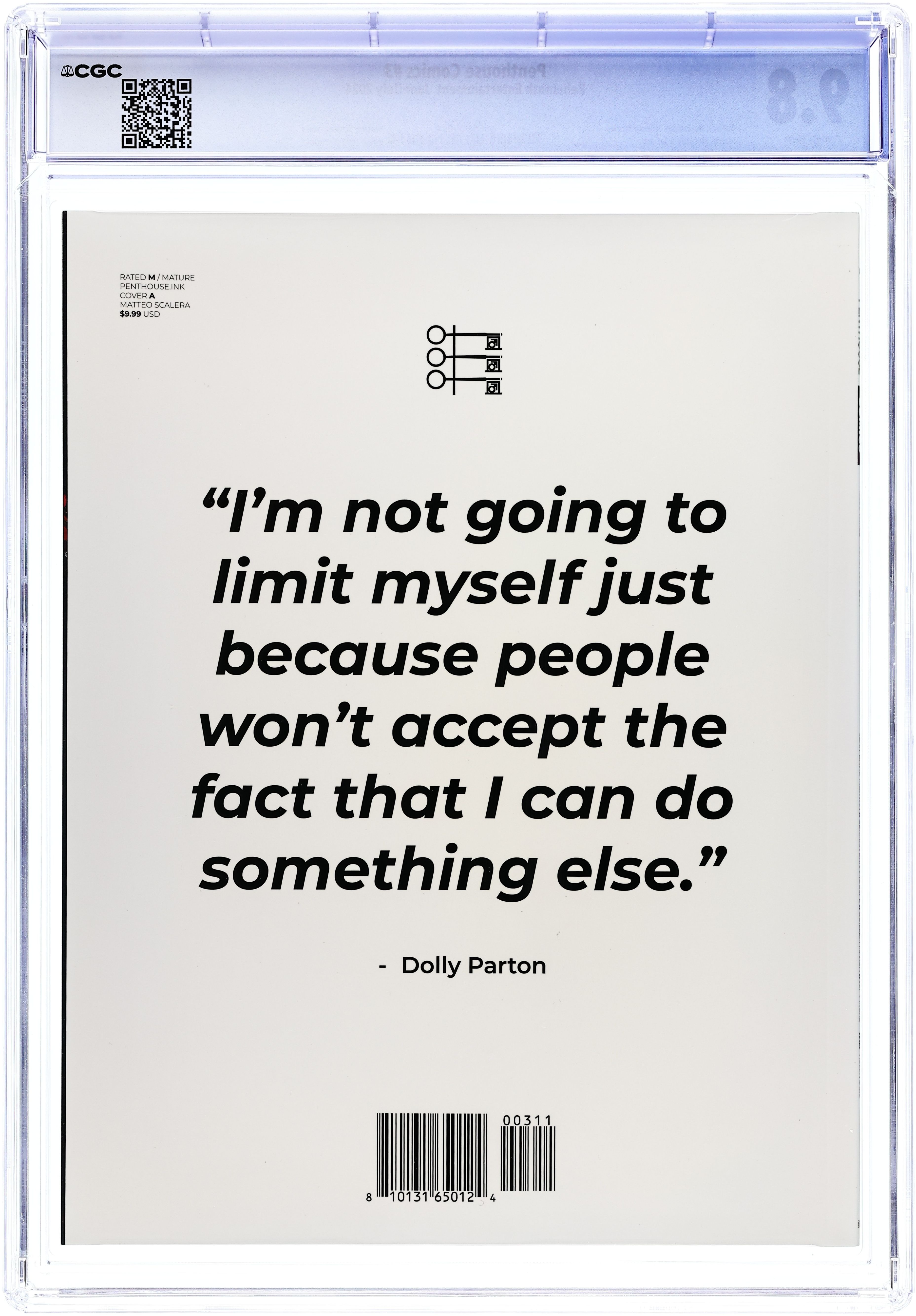 Starts Mar 2 Written by Jean-David Morvan & Various. Art by Guillem March & Various. Cover by Matteo Scalera. Cover art by Matteo Scalera. A Penthouse Comics regular, Matteo is known for his work for all major publishers on titles like Batman, Power Rangers, Black Science, and many more. Releasing 30 years after the original line debuted, Penthouse is proud to present the ongoing return of Penthouse Comics! Featuring a wealth of talent from all across the industry telling stories in the action, thriller, and horror genres, issue #3 continues the ongoing tales. Gun Crazy continues with the wild ride of Dolly Sanchez and Lanoya O'Brien, two girls fighting for survival in this violent story in the crossroads of Tarantino, VHS stuff, and the 80's. Guillem March continues with his incredible artwork on The Dream, a tale about Megan, a Hollywood casting director who attempts to bring out the potential actor hidden deep inside a stripper in the San Francisco suburbs. I Spit On Your Grave, is an adaptation of Vernon Sullivan's famous novel about Lee Anderson, whose only goal is to avenge the death of his brother. Along the way he'll fall into a life of debauchery and sex. The Dead All Have The Same Skin, continues with its tale about a mixed race bouncer in old world New York who must hide his identity to keep being accepted by society. But his brother, Richard has other plans. As always, Penthouse Comics features a bonus photoshoot and editorial! 96 pages, full color. Rated M Cover price $9.99. Grade: CGC 9.8 explanation of grade Condition: Used (collectible)