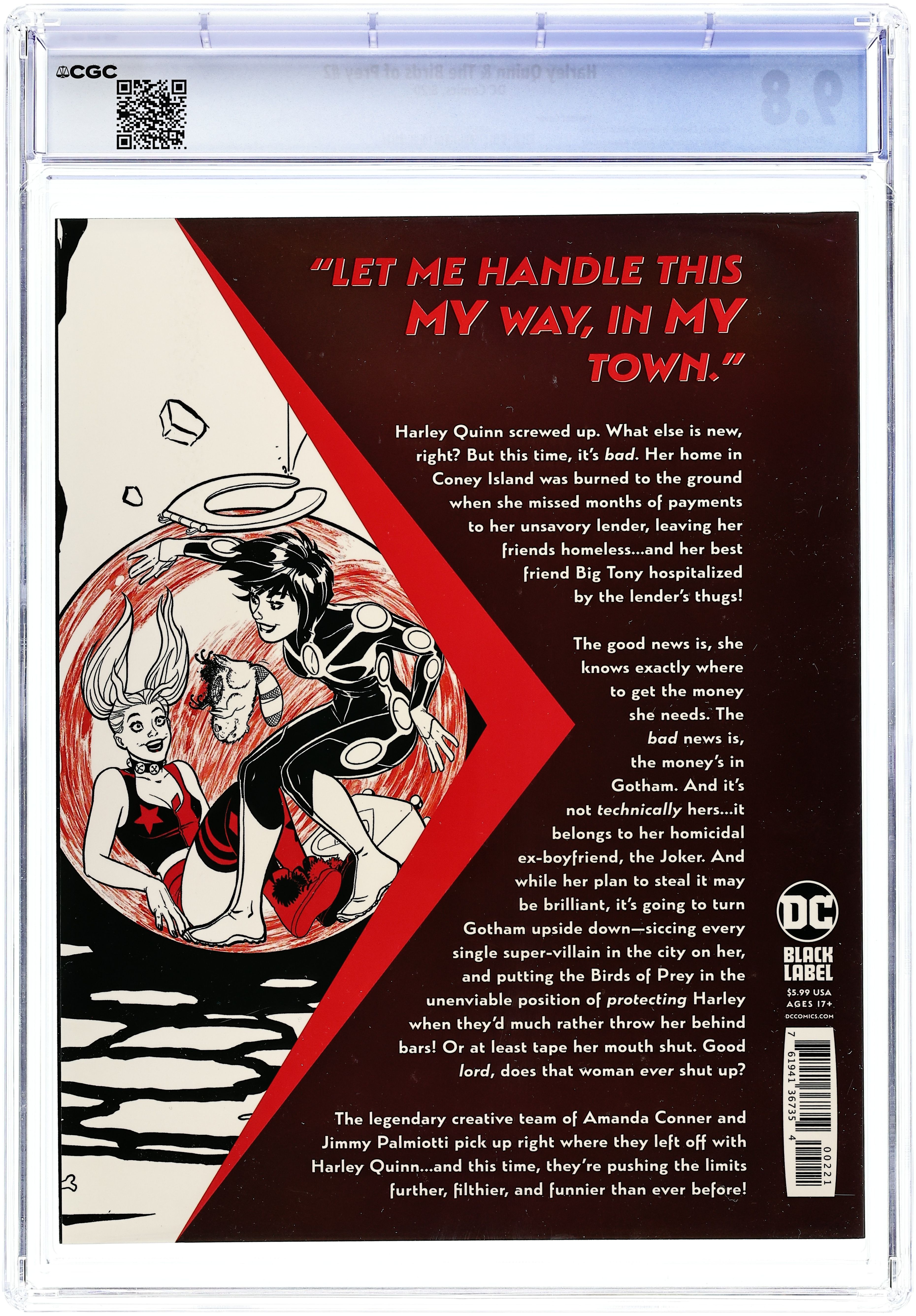 Written by Jimmy Palmiotti and Amanda Conner. Art by Amanda Conner. Cover by Arthur Adams. Over the course of her illustrious and very high-class career, Harley's met pretty much every super-villain who ever worked in Gotham City. Some hate her. Some love her. But none of that's gonna matter once they see how many zeroes there are on the bounty The Joker's offering for her head! Sorry, Harley-it's just business. Your next of kin will understand, right? Meanwhile, Cassandra Cain finds herself in the unenviable position of being Harley Quinn's bodyguard…but this could be her opportunity to learn a little about, y'know, loosening up? If she's currently wound too tight, then just sit next to Auntie Harley…she's got more than her share of loose screws! 32 pages, full color. Mature Readers Cover price $5.99. Grade: CGC 9.8 explanation of grade Condition: Used (collectible)