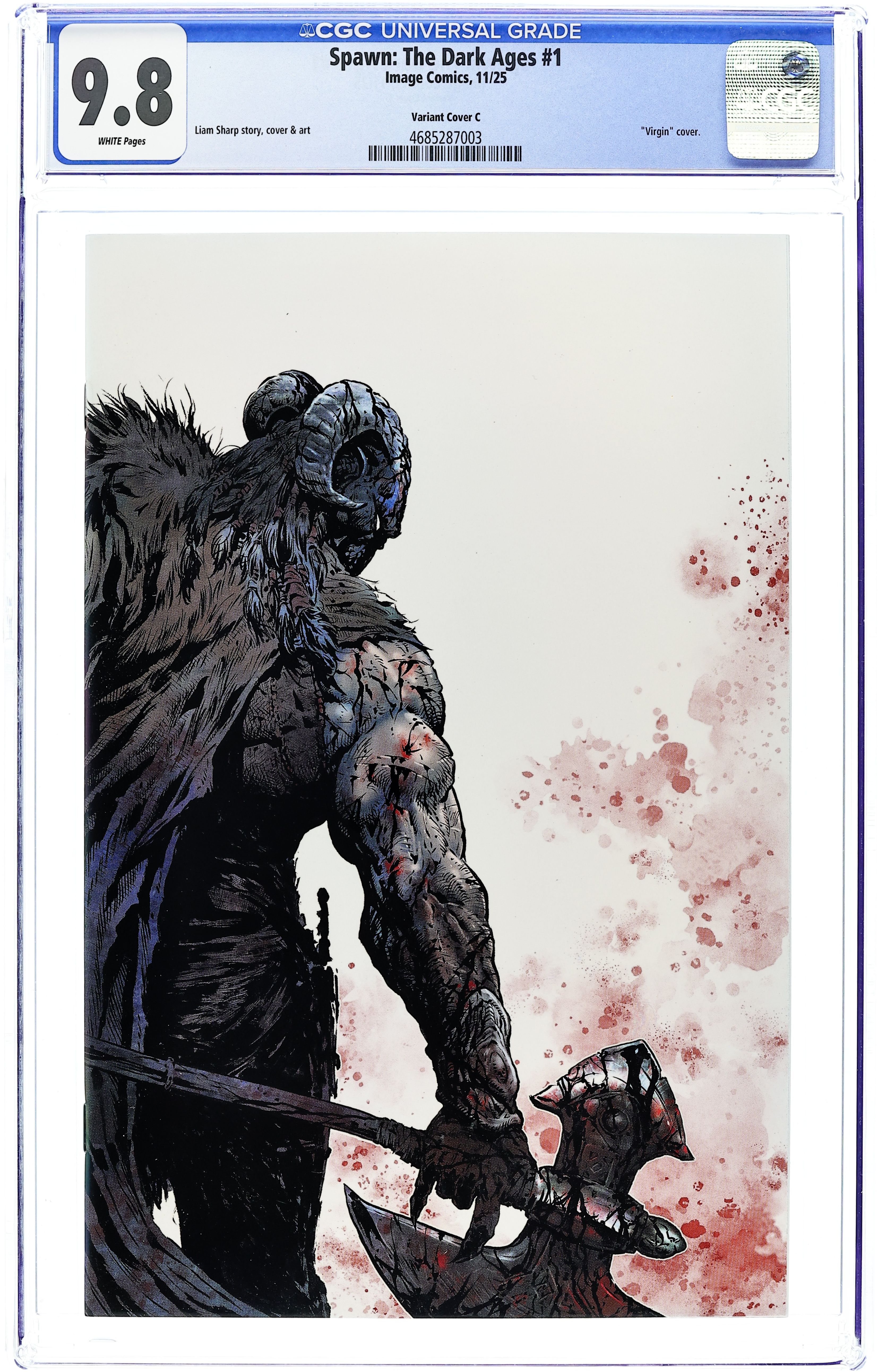 Starts Mar 9 (W) Liam McCormack-Sharp (A) Liam McCormack-Sharp (CA) Liam McCormack-Sharp 'Saxon barbarians harry Britain from the east. In the North, the Pictish threat looms. From the West, Hibernians send raiders from the land that shall one day be called Ireland. Aurelianus, newly anointed king, must defend Britain against all of these threats, whilst also dealing with the growing rebellion amongst his own people. For there are stories of another, more worthy king. One anointed by the old Celtic gods – whom the Christians refer to as the Devil Spawn...' An exciting new miniseries from acclaimed Artist and Writer, Liam Sharp. Epic brutality comes to the Spawn Universe. 24 pages, full color, not rated. Cover price $3.99. Grade: CGC 9.8 explanation of grade Condition: Used (collectible) unless item is a new release