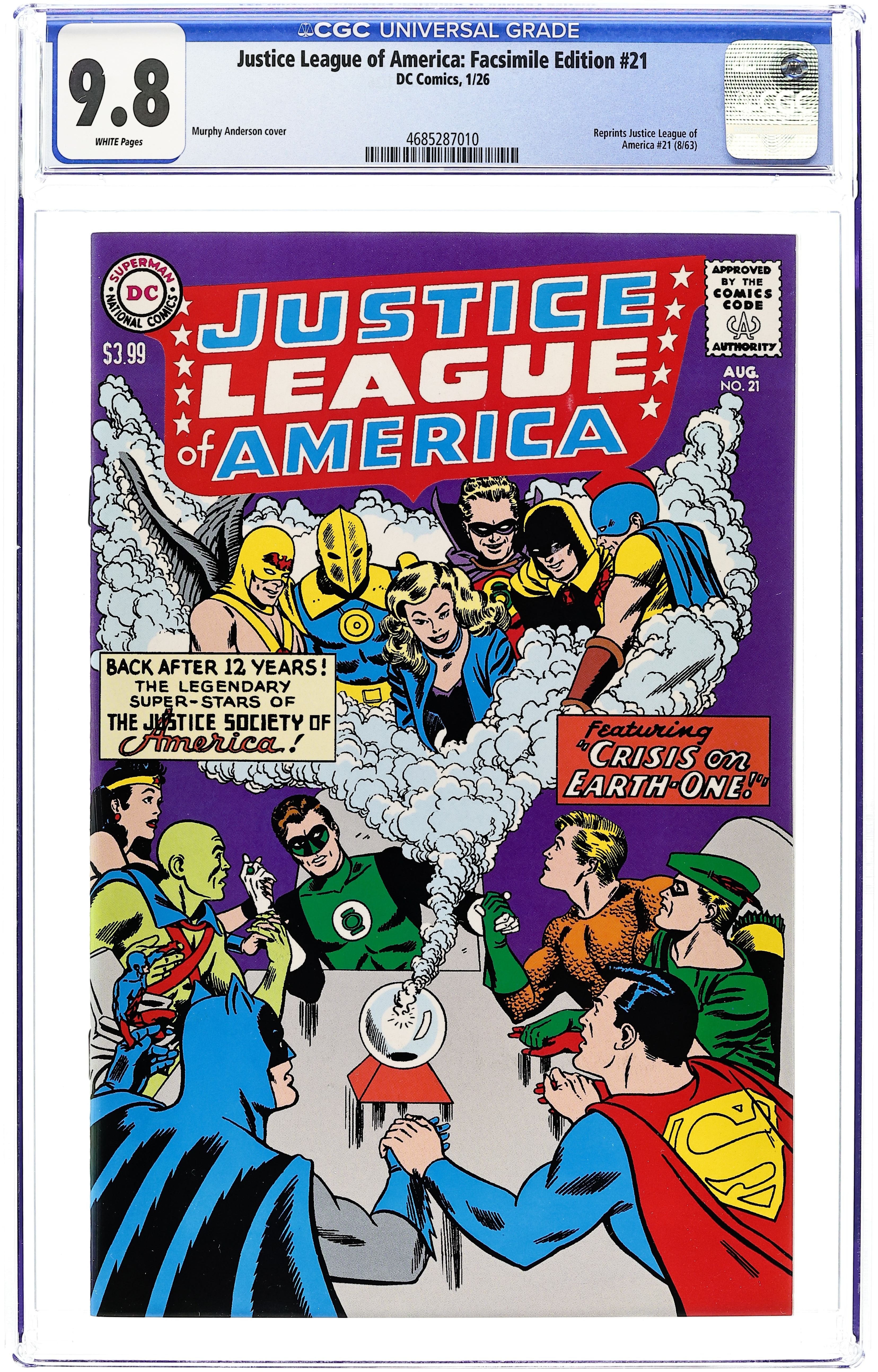 Starts Mar 9 (W) Gardner Fox (A) Mike Sekowsky (CA) Mike Sekowsky THE JUSTICE LEAGUE AND JSA TEAM UP FOR THE FIRST TIME! Crisis on Earth-One! Witness history in the making as the Justice League of America teams up with the legendary Justice Society of America for the very first time! The two titanic teams will need all the muscle they can muster to take down the combined criminal cohorts of two Earths--the Crime Champions! 32 pages, full color, rated 13+. Cover price $3.99. Grade: CGC 9.8 explanation of grade Condition: Used (collectible) unless item is a new release