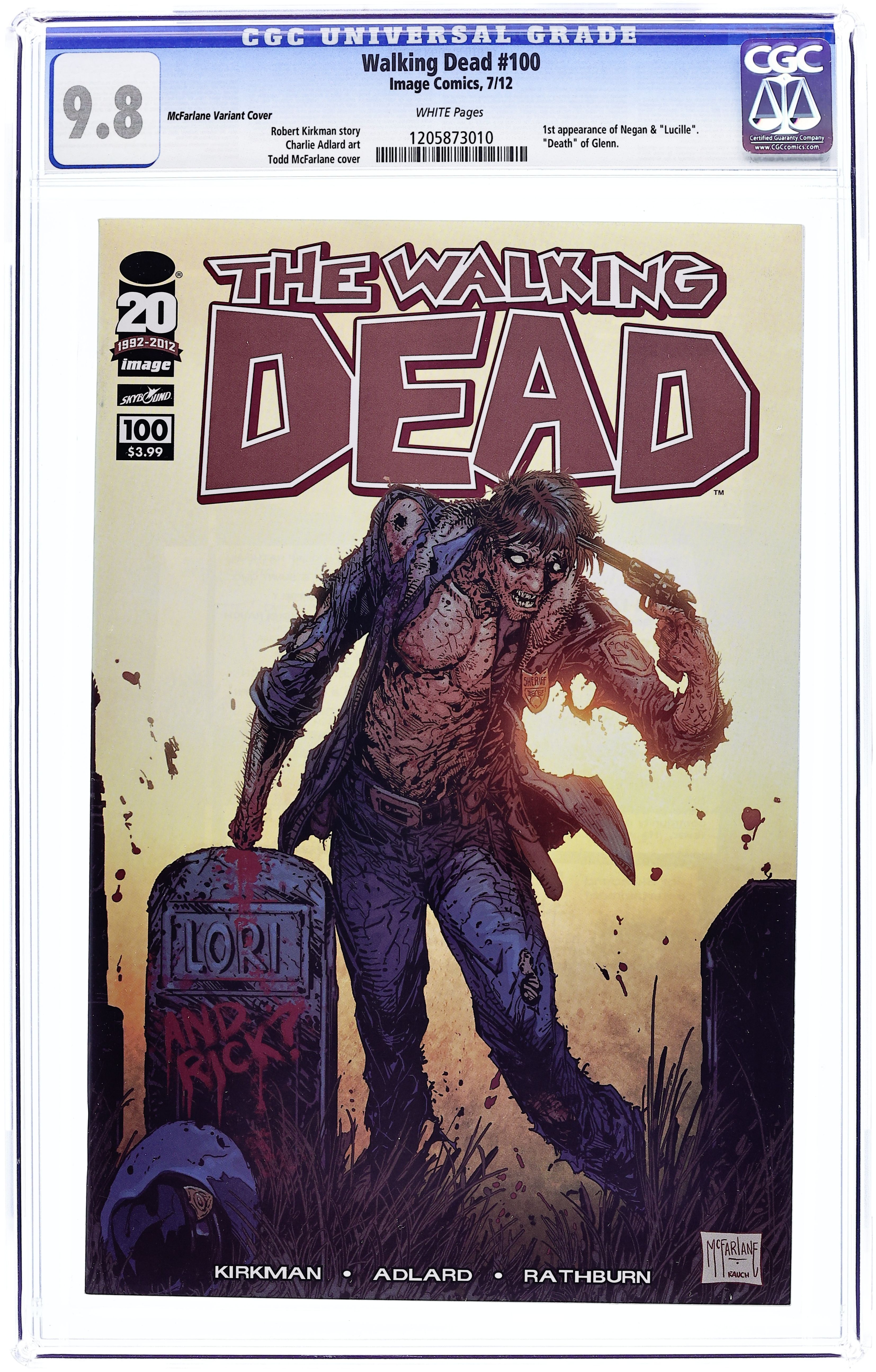 Starts Mar 16 Cover by Todd McFarlane Something to Fear: Part 4 of 6 - (W) Robert Kirkman (A) Charlie Adlard, Cliff Rathburn 'SOMETHING TO FEAR' CONTINUES! This extra-sized chapter contains one of the darkest moments in Rick Grimes' life, and one of the most violent and brutal things to happen within the pages of this series. 100 issues later, this series remains just as relentless as the debut issue. Do not miss the monumental 100th issue of THE WALKING DEAD! NOTE: 1st Appearance of of Negan & Lucille. Cover price $3.99. Grade: CGC 9.8 explanation of grade Condition: Used (collectible)