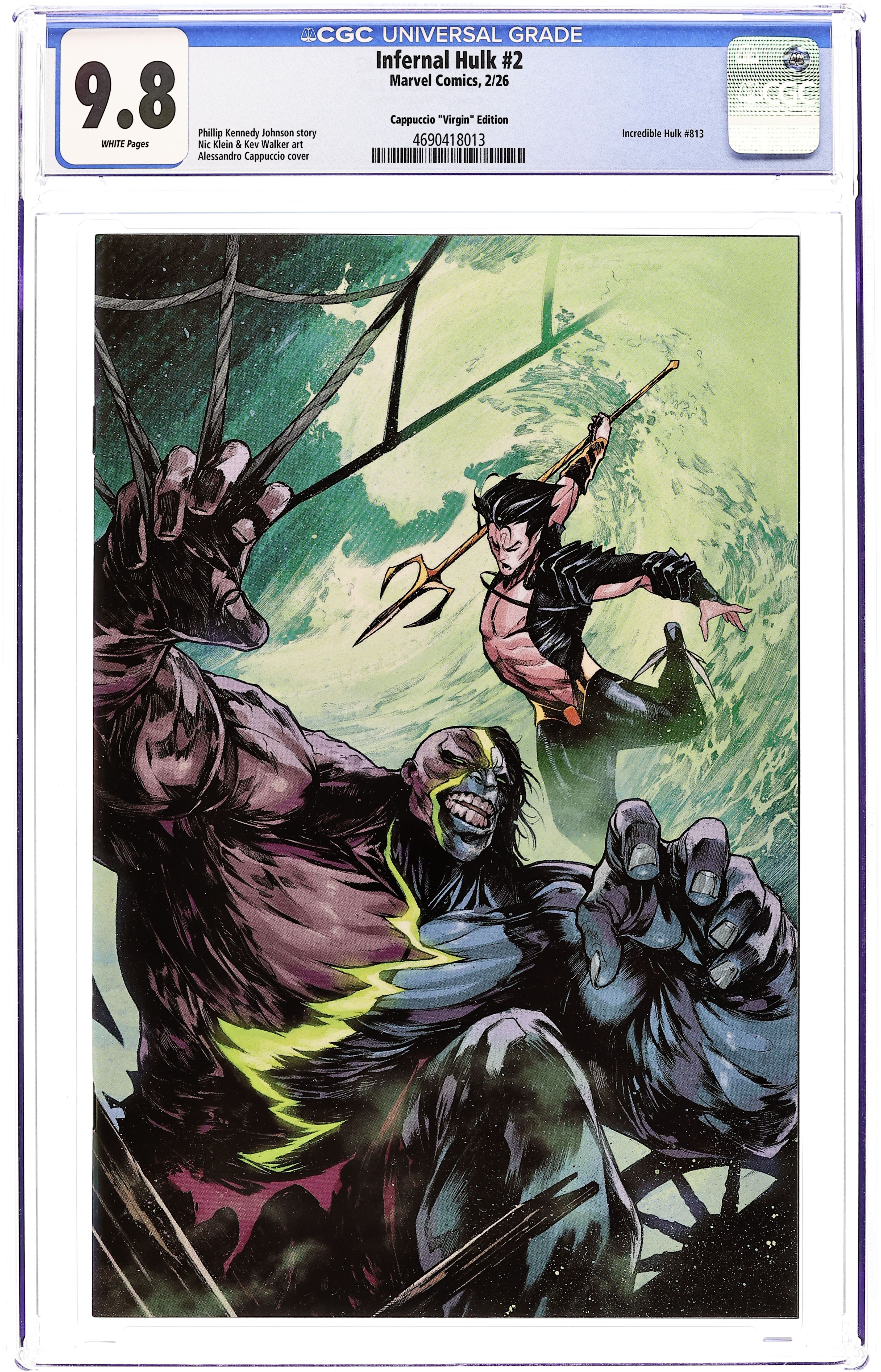 Starts Mar 9 Limited 1 for 50 Retailer Incentive Variant Cover.(W) Phillip Kennedy Johnson (A) Nic Klein (CA) Alessandro Cappuccio RULE ALL MONSTERS! The INFERNAL HULK's conquest of Earth has begun! Hulk turns his eye to ATLANTIS, where an ancient evil has slept for eons awaiting the call of the Mother of Horrors… but will NGATHIIL THE ENDLESS be content to serve Hulk, rather than rule Earth in his mother's place? Meanwhile, Earth's Mightiest Heroes frantically scour the Earth for the only one who MIGHT hold the key to victory! Where - if he's even still alive - is Bruce Banner? RATED PARENTAL ADVISORY. Cover price $3.99. Grade: CGC 9.8 explanation of grade Condition: Used (collectible) unless item is a new release