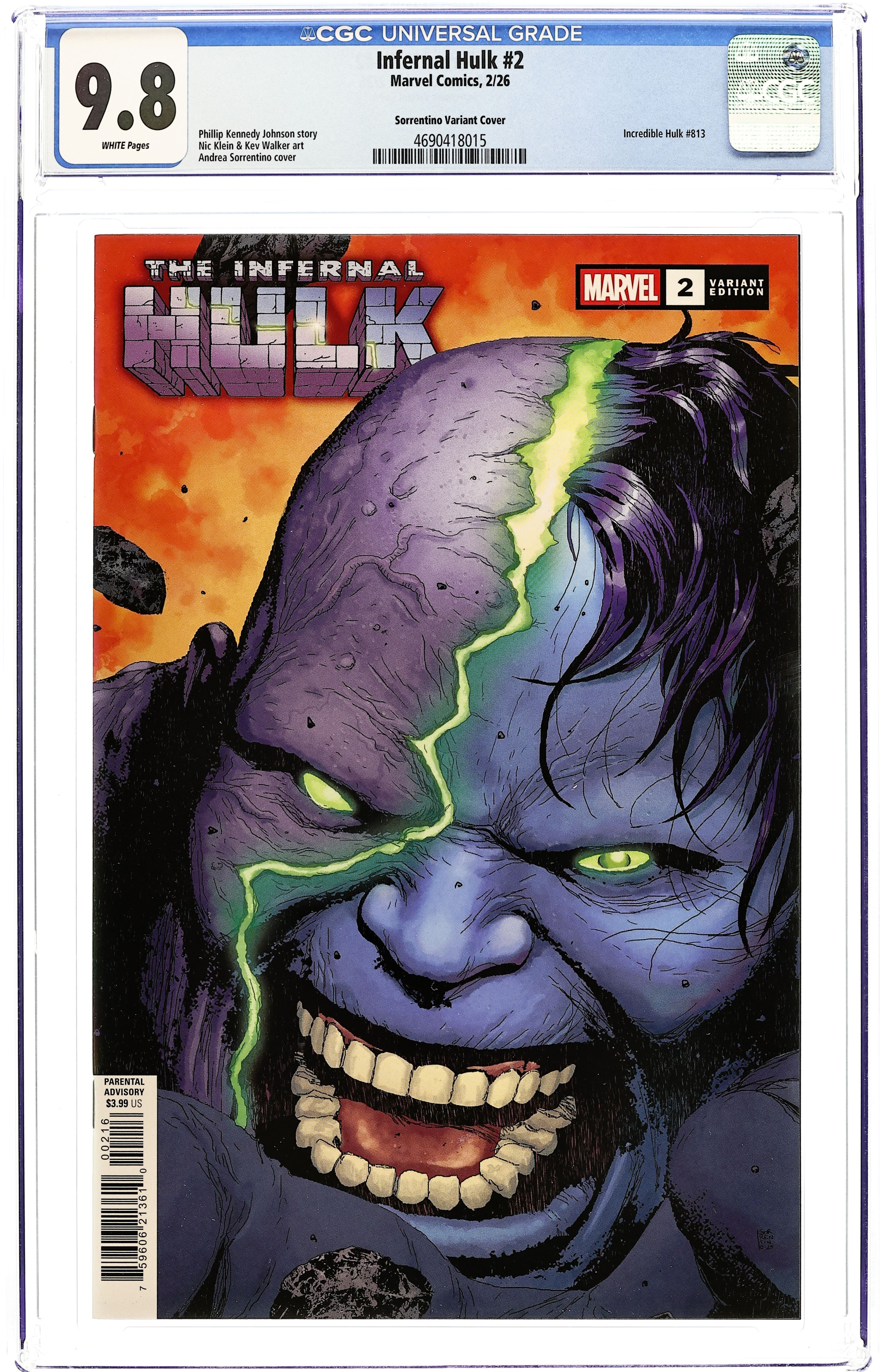 Starts Mar 9 Limited 1 for 25 Retailer Incentive Variant Cover.(W) Phillip Kennedy Johnson (A) Nic Klein (CA) Andrea Sorrentino RULE ALL MONSTERS! The INFERNAL HULK's conquest of Earth has begun! Hulk turns his eye to ATLANTIS, where an ancient evil has slept for eons awaiting the call of the Mother of Horrors… but will NGATHIIL THE ENDLESS be content to serve Hulk, rather than rule Earth in his mother's place? Meanwhile, Earth's Mightiest Heroes frantically scour the Earth for the only one who MIGHT hold the key to victory! Where - if he's even still alive - is Bruce Banner? RATED PARENTAL ADVISORY. Cover price $3.99. Grade: CGC 9.8 explanation of grade Condition: Used (collectible) unless item is a new release