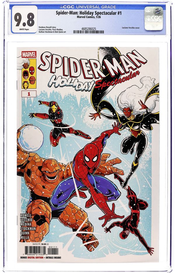 Starts Mar 23 (W) Rainbow Rowell (A) Luciano Vecchio, Bob Quinn, Nathan Stockman (CA) Luciano Vecchio HOLIDAY PLANS NO MORE! Peter Parker is all alone for the holidays… Luckily, the Spectacular Spider-Man has some amazing friends he can celebrate with! But can the Fantastic Four, the Avengers, the X-Men, Daredevil and more handle winter with the wisecrackin' Web-Head? Or will the Thing have to send Spidey packing to ensure a silent night? Rainbow Rowell and a bevy of Marvel's finest artists deliver a holiday romp to all the good boys and girls who read magnificent Marvel mags! 32 pages, full color, rated T. Cover price $4.99. Grade: CGC 9.8 explanation of grade Condition: Used (collectible) unless item is a new release
