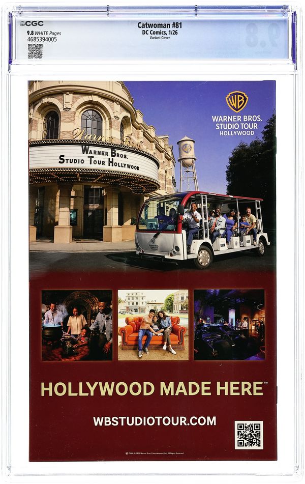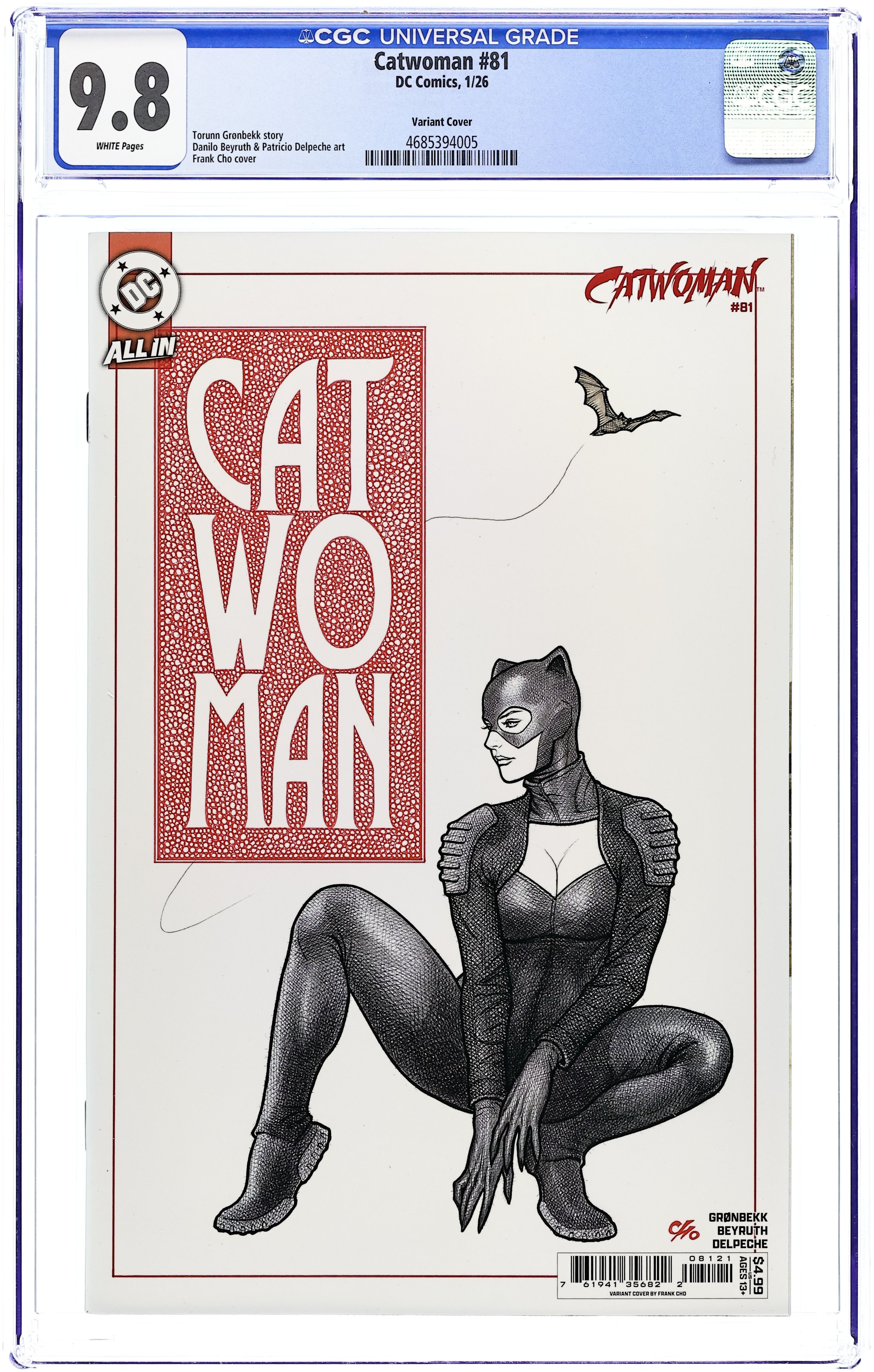 Starts Mar 16 (W) Torunn Gronbekk (A) Danilo Beyruth, Patricio Delpeche (CA) Frank Cho THE DEATH OF INNOCENCE! Maria Kyles death had unforeseen consequences that reach all the way into Selina Kyles present. Speaking of which, things are getting pretty hot in Venice, but Catwomans eyes are set on Carmine Falcones prize--and she wont be leaving the party without it! Even if she needs to kill him to get her way... 32 pages, full color, rated teen+. Cover price $4.99. Grade: CGC 9.8 explanation of grade Condition: Used (collectible) unless item is a new release