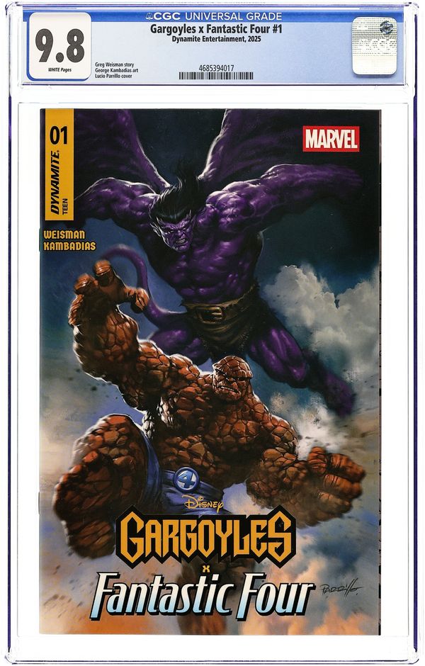 Starts Mar 23 (W) Greg Weisman (A) George Kambadais (CA) Lucio Parrillo DISNEYS STONE GUARDIANS MEET MARVELS FIRST FAMILY! When the Manhattan Clan are invited on a tour of the world-famous Baxter Building — the high-tech home of the Fantastic Four — things quickly go from impressive to destructive when Coldsteel joins forces with the Dragon Man to unleash the terror that is Annihilus — trapping Franklin, Valeria, and Gnash in the Negative Zone in the process! Now, both of these heroic extended families — enchanted stone and super-human alike — must team up in an all-out effort to save their children, their city, and their whole world from destruction! Written by Gargoyles creator GREG WEISMAN and illustrated by celebrated artist GEORGE KAMBADAIS, the 40-page special features non-stop action and adventure, with cosmically iconic covers provided by LUCIO PARRILLO, DECLAN SHALVEY, AMANDA CONNER, MARK BAGLEY, and NICOLETTA BALDARI! 40 pages, full color, rated teen. Cover price $5.99. Grade: CGC 9.8 explanation of grade Condition: Used (collectible) unless item is a new release