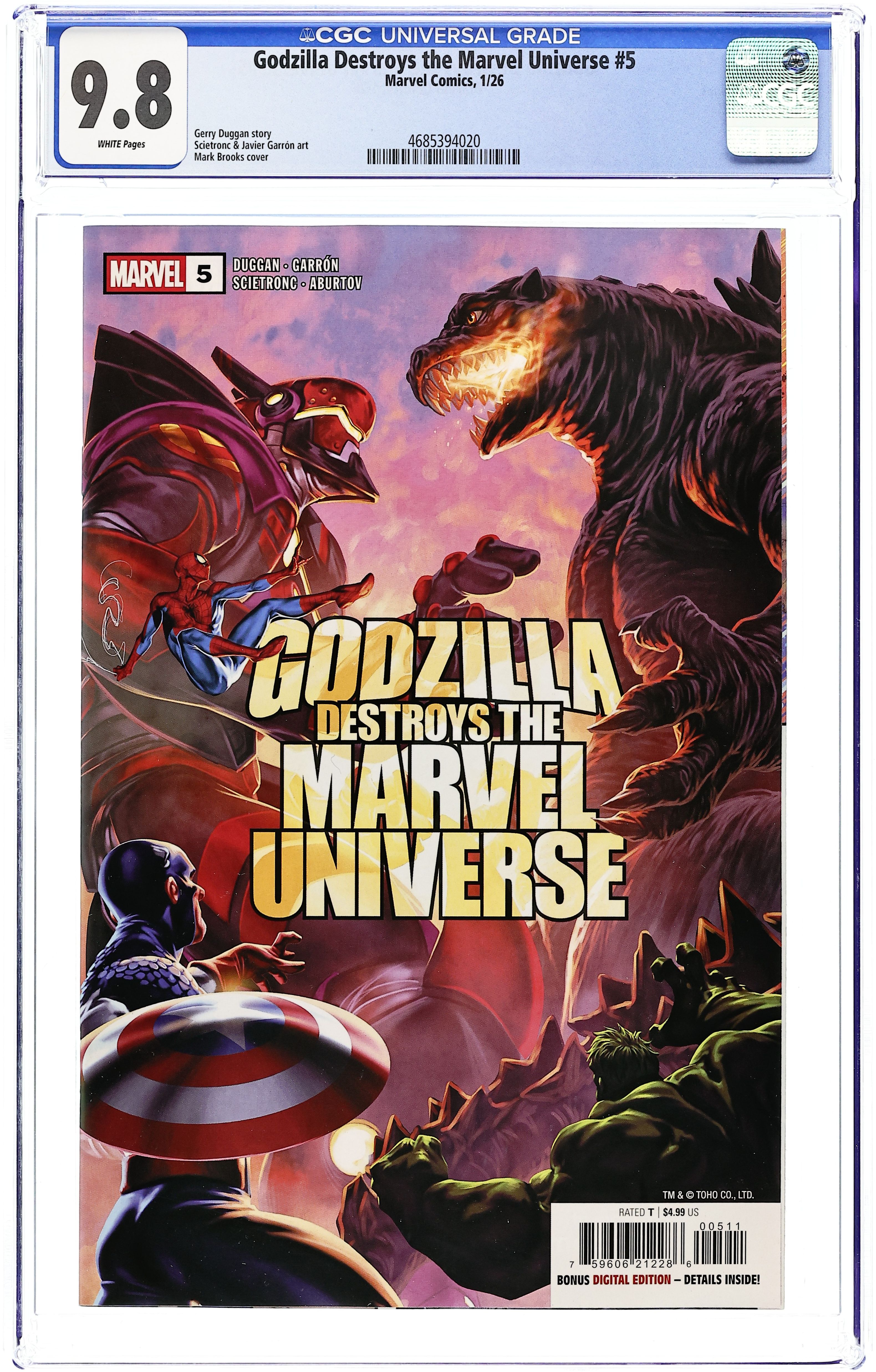 Starts Mar 23 (W) Gerry Duggan (A) Javier Garron (CA) Mark Brooks WORLD WAR GODZILLA! Make way, True Believers, as Black Panther debuts the mightiest weapon the Marvel Universe has ever seen before in this earth-shattering showdown between Godzilla and Marvel MECHA! As the two titans trade blows, the rest of the heroes race to exploit Godzilla's mysterious relationship to vibranium to help slow down the leviathan - but as the war between the King of the Monsters and the heroes of the Marvel Universe rages on, only one thing is certain: For whoever is left standing in the wreckage, the Marvel Universe will never be the same again! 32 pages, full color, rated teen. Cover price $4.99. Grade: CGC 9.8 explanation of grade Condition: Used (collectible) unless item is a new release