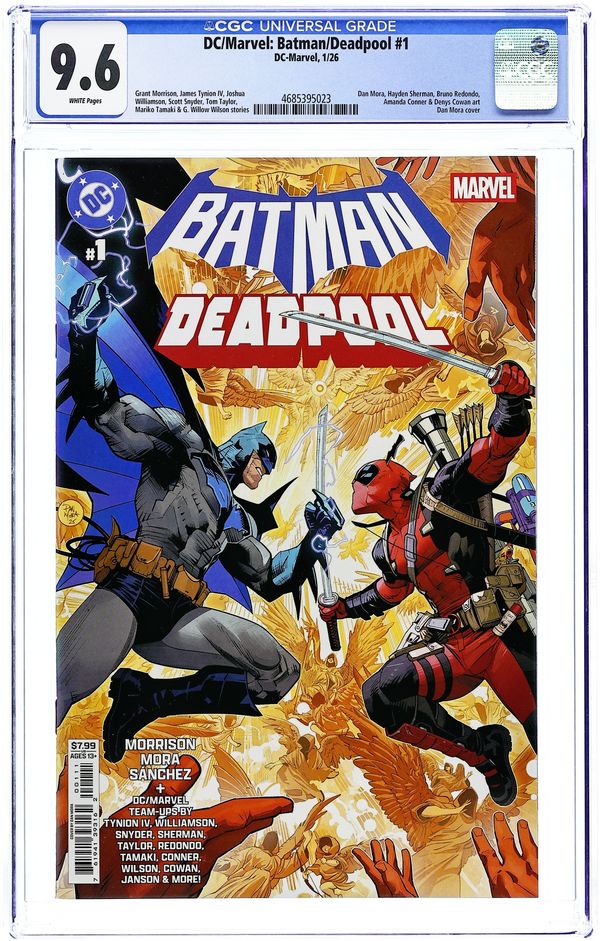 Starts Mar 23 (W) Various (A) Various (CA) Dan Mora THE MOMENT YOU'VE BEEN WAITING FOR! Written by Grant Morrison, Scott Snyder, James Tynion IV, Joshua Williamson, Tom Taylor, Mariko Tamaki and G. Willow Wilson Art by Dan Mora, Hayden Sherman, Bruno Redondo, Amanda Conner and Denys Cowan The Dark Knight and the Merc with a Mouth team up for an adventure so mind-bending youll think youre in a dream! Brought to you by legendary creators Grant Morrison and Dan Mora! And be sure not to miss these incredible extra stories: Scott Snyder, James Tynion IV, and Joshua Williamson team up with Hayden Sherman for a magical Constantine/Doctor Strange tale! Tom Taylor and Bruno Redondo bring you an epic Nightwing/Dick Grayson and Laura Kinney/Wolverine story! Mariko Tamaki and Amanda Conner smash Harley Quinn and the Hulk together! G. Willow Wilson and Denys Cowan tell an electrifying Static and Ms. Marvel yarn! 64 pages, full color, rated 13+. Cover price $7.99. Grade: CGC 9.6 explanation of grade Condition: Used (collectible) unless item is a new release
