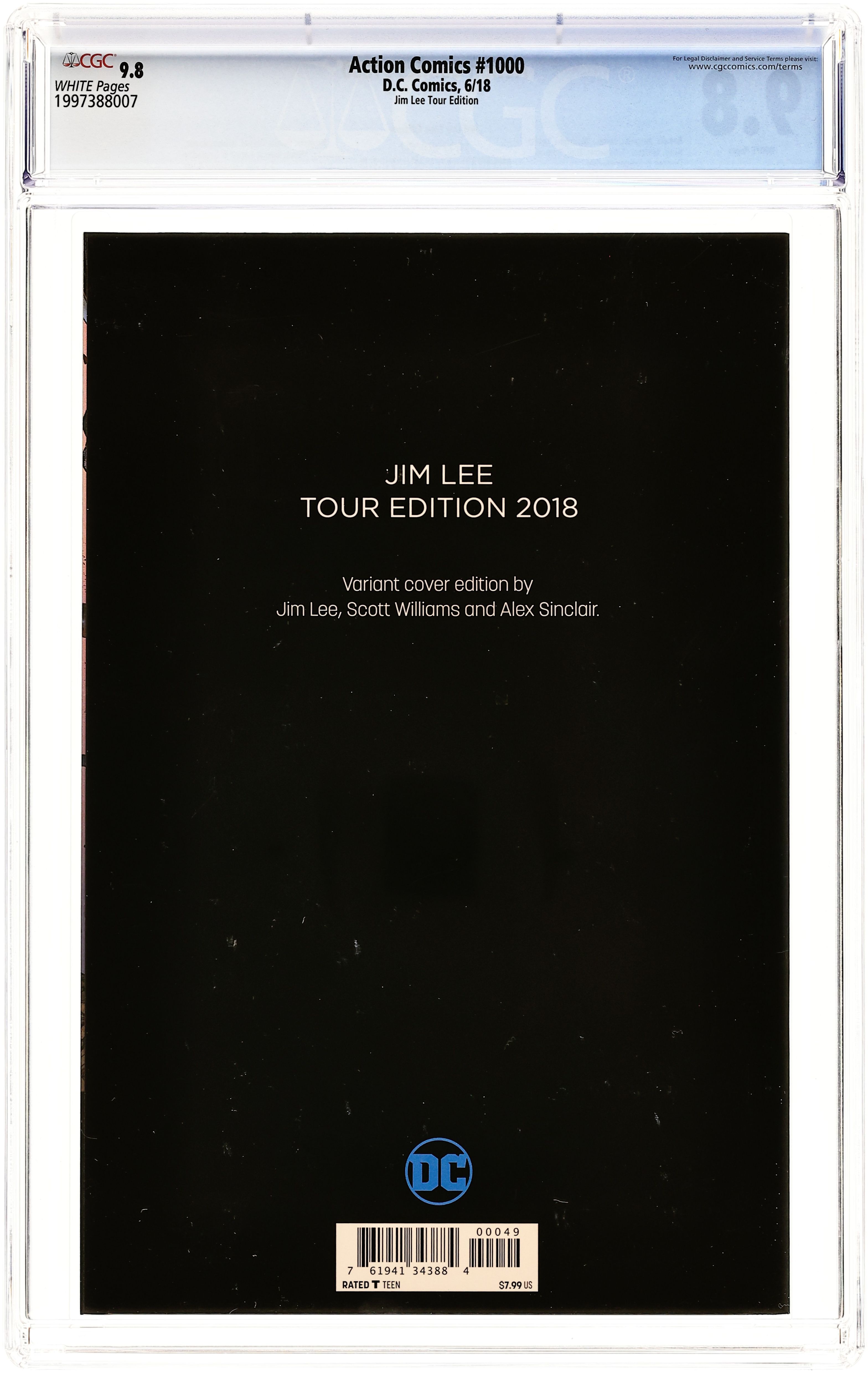 Starts Mar 16 Tour Edition cover by Jim Lee. Written by Dan Jurgens, Peter J. Tomasi, Marv Wolfman, Geoff Johns, Richard Donner, Scott Snyder, Tom King, Louise Simonson, Paul Dini, Brad Meltzer and Brian Michael Bendis. Art by Dan Jurgens, Norm Rapmund, Patrick Gleason, Curt Swan, Butch Guice, Kurt Schaffenberger, Olivier Coipel, Rafael Albuquerque, Clay Mann, Jerry Ordway, José Luis García-López, Kevin Nowlan, John Cassaday, Jim Lee and Scott Williams. Celebrate 1000 issues of Action Comics with an all-star lineup of top talent as they pay tribute to the comic that started it all! From today's explosive action to a previously unpublished tale illustrated by the legendary Curt Swan to the Man of Tomorrow's future, this very special, oversized issue presents the best of the best in Superman stories! Featuring: "From the City That Has Everything" by Dan Jurgens and Norm Rapmund; "Never-Ending Battle" by Peter J. Tomasi and Patrick Gleason; "An Enemy Within" by Marv Wolfman, Curt Swan, Butch Guice and Kurt Schaffenberger (note: original story by Cindy Goff, Swan and Guice, with the final page courtesy of Superman The Secret Years (1985) #2 by Bob Rozakis, Swan and Schaffenberger); "The Car" by Geoff Johns, Richard Donner and Olivier Coipel; "The Fifth Season" by Scott Snyder and Rafael Albuquerque; "Of Tomorrow" by Tom King and Clay Mann; "Five Minutes" by Louise Simonson and Jerry Ordway; "Actionland!" by Paul Dini, José Luis García-López and Kevin Nowlan; "Faster Than a Speeding Bullet" by Brad Meltzer and John Cassaday; and "The Truth" by Brian Michael Bendis, Jim Lee and Scott Williams. Plus: Pin-ups by John Romita, Jr. and Danny Miki, Walter Simonson, and Jorge Jimenez. Softcover, 80 pages, full color. Rated T Cover price $7.99. Grade: CGC 9.8 explanation of grade Condition: Used (collectible)