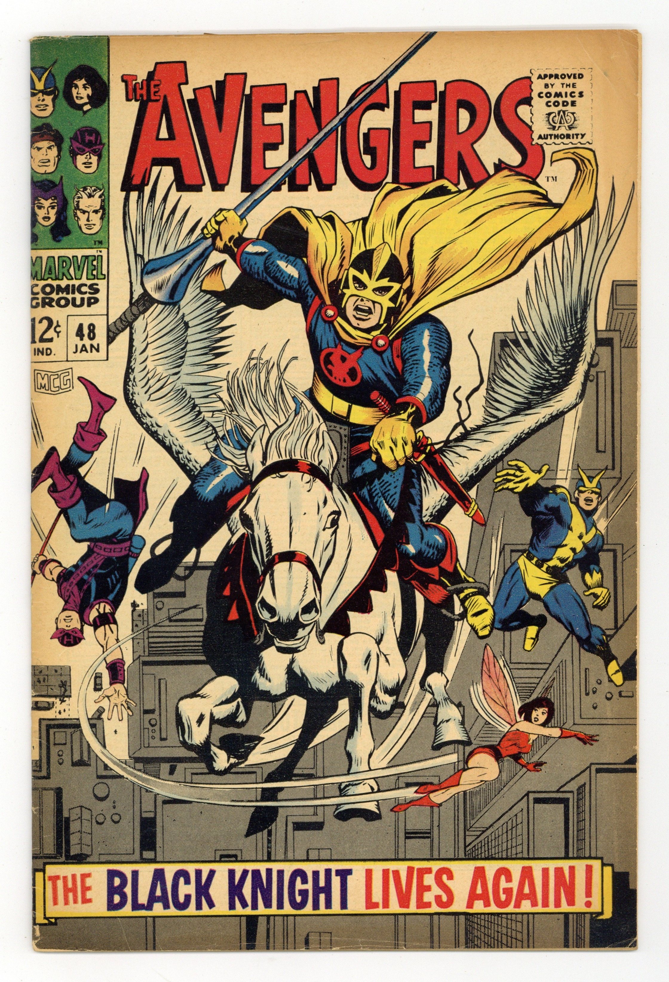 Starts Apr 20 First appearance of the new Black Knight (aka Dane Whitman) in "The Black Knight Lives Again!" Script by Roy Thomas. Art by George Tuska. Cover by George Tuska. Inside Garrett Castle Quicksilver and the Scarlet Witch are prisoners of Magneto! And the Master of Magnetism is admonishing them to rejoin the brotherhood! While elsewhere in the castle, a stunning transformation is occurring as Dane Whitman decides to take up the mantle of the Black Knight! Dane wants the knight to become a force for good! So, his first act is to fly to Avengers Mansion and tell the Avengers about Wanda and Pietro's plight! But Earth's Mightiest Heroes mistake Dane for the evil Black Knight and attack! Will the new knight's career be over before it even starts? Meanwhile in Olympus, Hercules discovers the Temple of the Promethean Flame in ruins and his fellow gods missing! Origin of the new Black Knight. First appearance of Aragorn - the winged horse. Cameo appearances by Jarvis and the Toad. Flashback cameo by Nathan Garrett - the previous Black Knight. Avengers Lineup: Hawkeye, Goliath (aka Hank Pym), Hercules, Quicksilver, Scarlet Witch, and the Wasp. (Notes: The letters page includes a letter from comics historian Peter Sanderson. This issue was reprinted in Marvel Triple Action #40.) 36 pages, full color. Cover price $0.12. Grade: VG 4.0 explanation of grade Condition: Used (collectible)