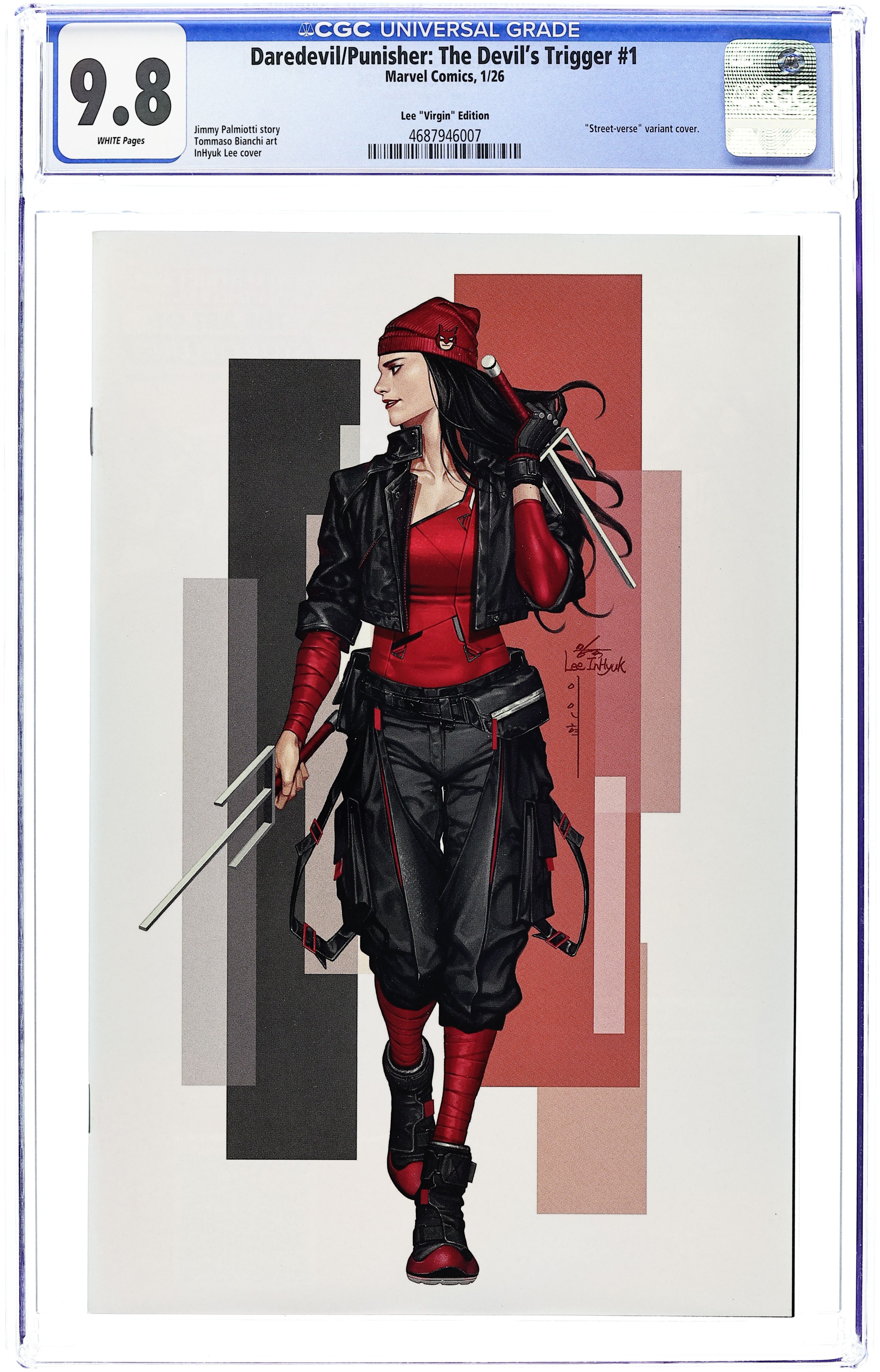 Starts Mar 9 Limited 1 for 20 Retailer Incentive Variant Cover.(W) Jimmy Palmiotti (A) Tommaso Bianchi, Chris Giarrusso, Philip Tan (CA) Inhyuk Lee DO YOU HAVE WHAT IT TAKES TO PULL THE TRIGGER? DAREDEVIL and THE PUNISHER - two of Marvel's mightiest with one of the most celebrated and storied rivalries in comics find themselves at odds, not only with each other, but with New York's criminal element once again! Writer Jimmy Palmiotti revisits the world that was, as Frank Castle is pitted against the Gnucci crime family for their most violent and visceral confrontation yet! As their conflict threatens to tear Hell's Kitchen apart, it'll fall to DAREDEVIL to contain the chaos! Cover price $4.99. Grade: CGC 9.8 explanation of grade Condition: Used (collectible) unless item is a new release