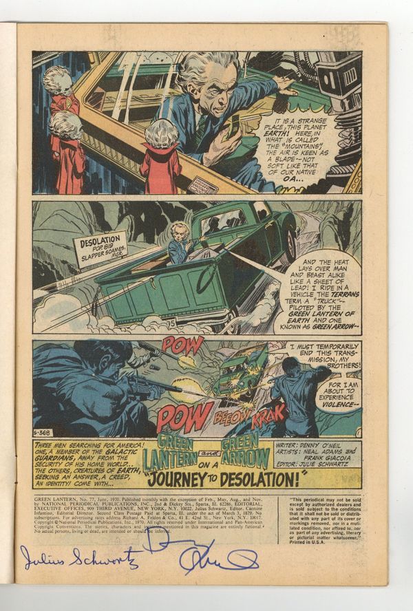 Signed by Julius Schwartz, and Denny O'Neil (splash page). No autograph certification is included.