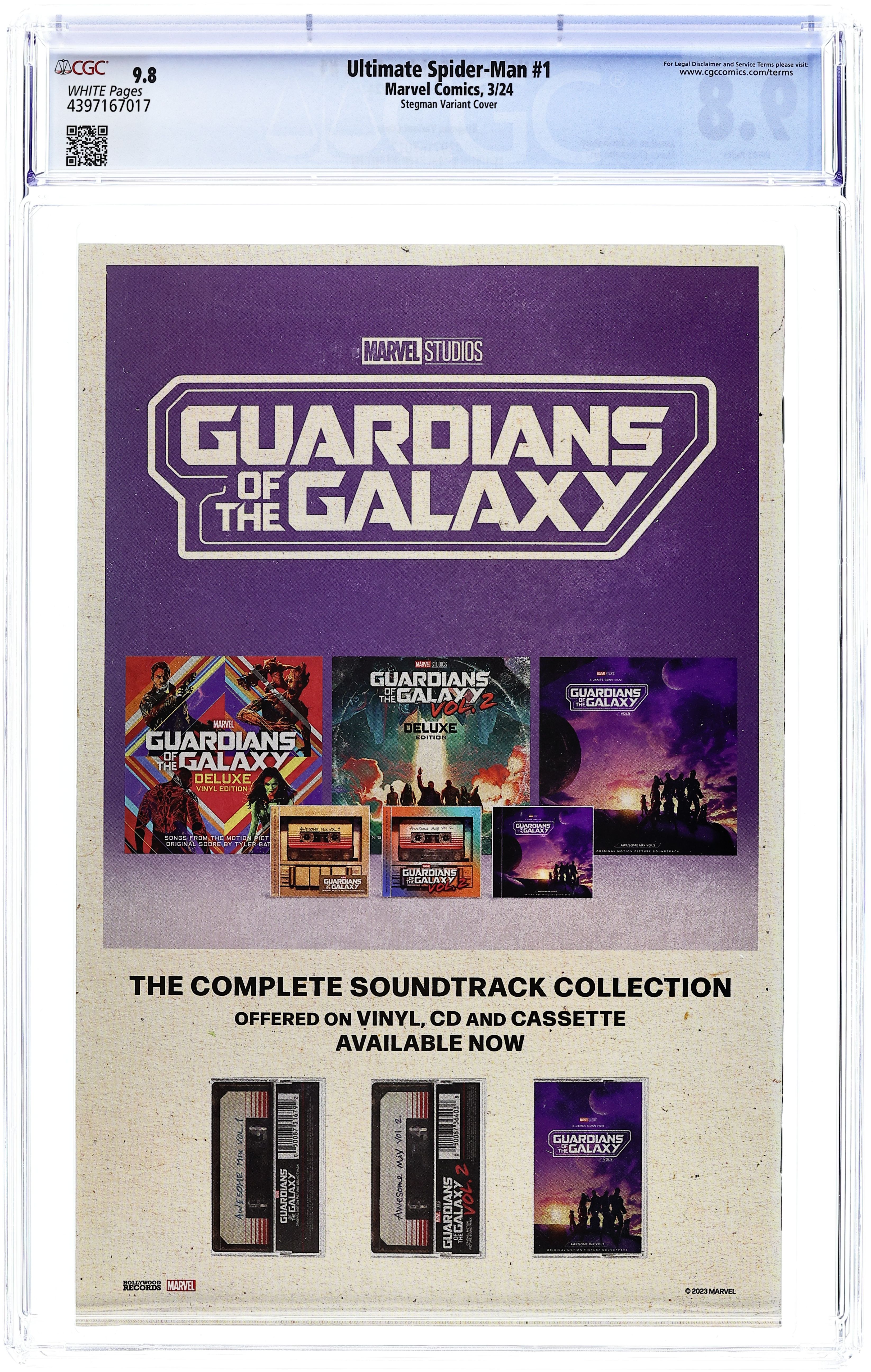 Written by Jonathan Hickman. Art by Marco Checchetto. Cover by Ryan Stegman. THE NEW ULTIMATE SPIDER-MAN FOR A NEW ULTIMATE UNIVERSE!Visionary writer Jonathan Hickman (HOUSE OF X/POWERS OF X) and acclaimed artist Marco Checchetto (DAREDEVIL) bring you a bold new take on Spider-Man, with this, the debut title of the new line of Ultimate Comics! After the events of ULTIMATE INVASION, the world needs a hero...who will rise up to take on that responsibility? Prepare to be entangled in a web of mystery and excitement as the all-new ULTIMATE SPIDER-MAN comic redefines the wall-crawler for the 21st Century! 48 pages, full color. Rated T Cover price $5.99. Grade: CGC 9.8 explanation of grade Condition: Used (collectible)