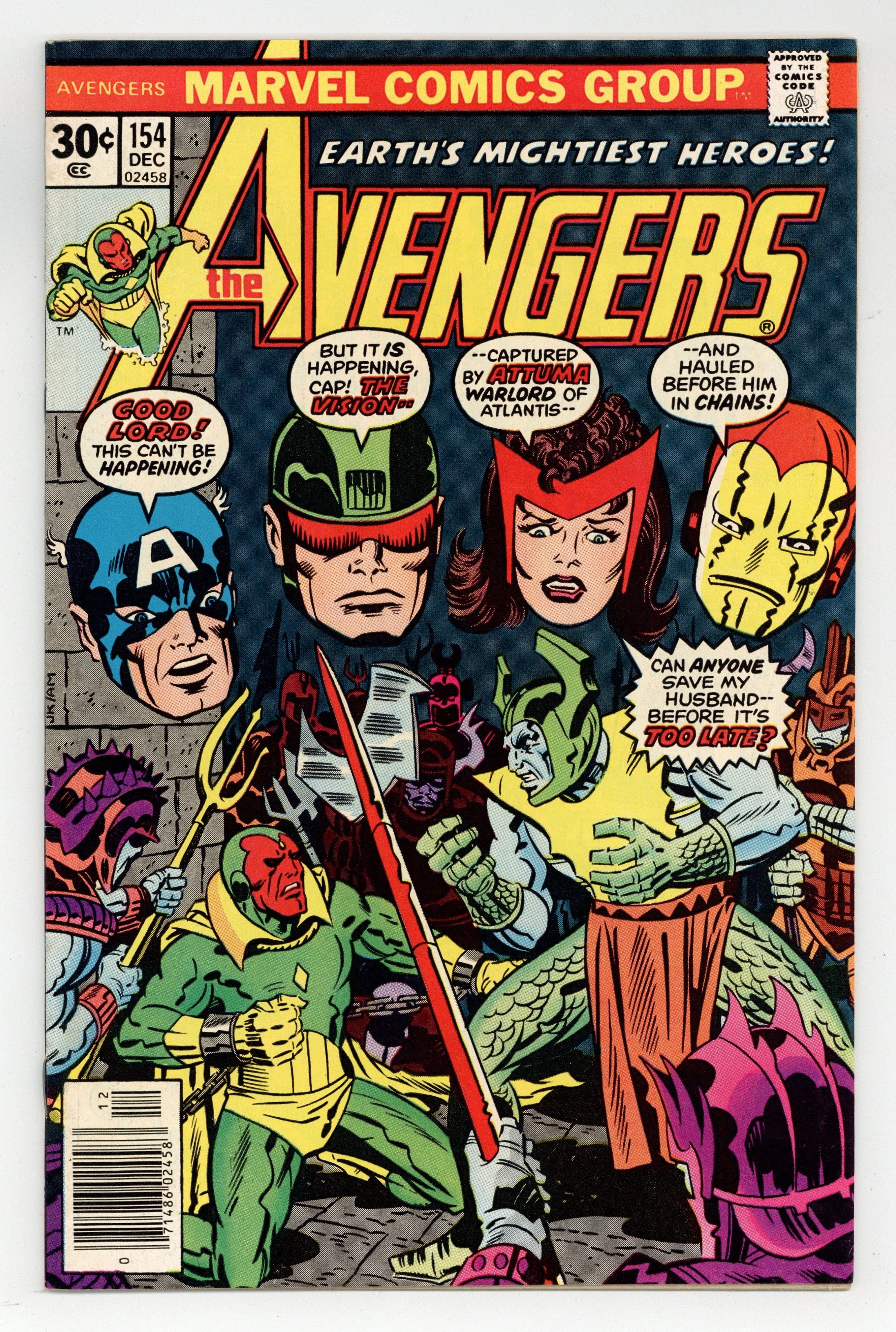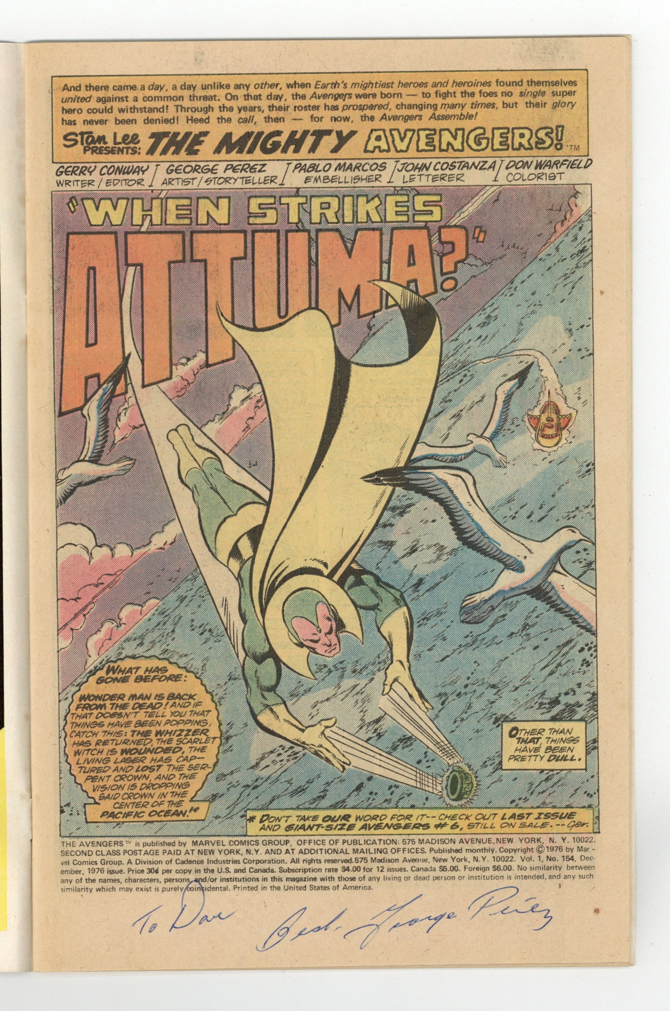 Starts Mar 23 "When Strikes Attuma?" Part 1 of 4. Script by Gerry Conway. Pencils by George Perez. Inks by Pablo Marcos. Cover by Jack Kirby and Al Milgrom. Following the Avengers' awesome battle against the Living Laser in Avengers Annual 6, the Vision drops the Serpent Crown into the Pacific Ocean to dispose of the crown forever. However, on his way back to the mainland, the synthezoid avenger is ambushed by the henchmen of Attuma! Why is Prince Namor's long-time foe attacking the Vision? Meanwhile back at Avengers Mansion, the Scarlet Witch and Jarvis wage a desperate battle for survival against another agent of Attuma...the powerful Tyrak! Will Cap, Shell-head, and the Beast get back to the mansion in time to save their faithful butler and Wanda? The situation does not look good for Earth's Mightiest Heroes! Story (part 2) continues in Super-Villain Team-Up 9. First appearance of Tyrak. Cameo appearance by the Whizzer. Avengers Lineup: Beast, Captain America, Iron Man, Scarlet Witch, Vision, Wasp, Wonder Man, and Yellowjacket. (Note: Attuma previously appeared in Super-Villain Team-Up 3.) 36 pages Cover price $0.30. Grade: FN+ 6.5 explanation of grade Condition: Used (collectible)