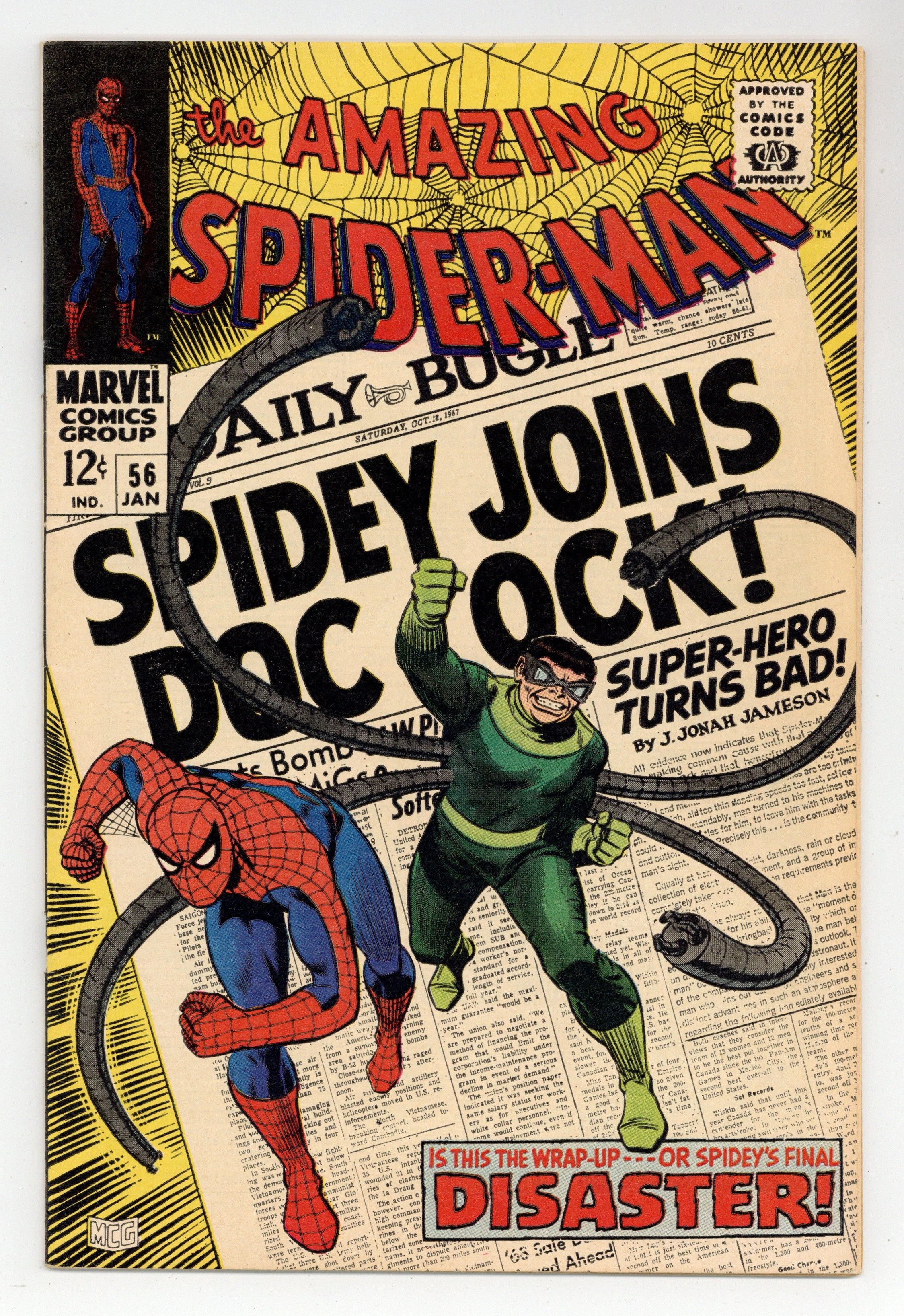 Starts Mar 23 Doctor Octopus appearance and the first appearance of Capt. Stacy in "Disaster" script by Stan Lee, pencils by John Romita Sr., inks by Mike Esposito as "Mickey Demeo." Spidey has amnesia, and Doc Ock convinces him that they are partners! Will he fall for it? Or just go along until his memory comes back? Romita cover. Reprinted in Marvel Tales # 41. 36 pgs. Cover price $0.12. Grade: FN/VF 7.0 explanation of grade Condition: Used (collectible)