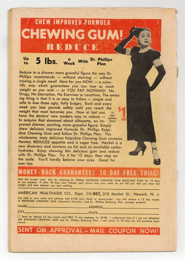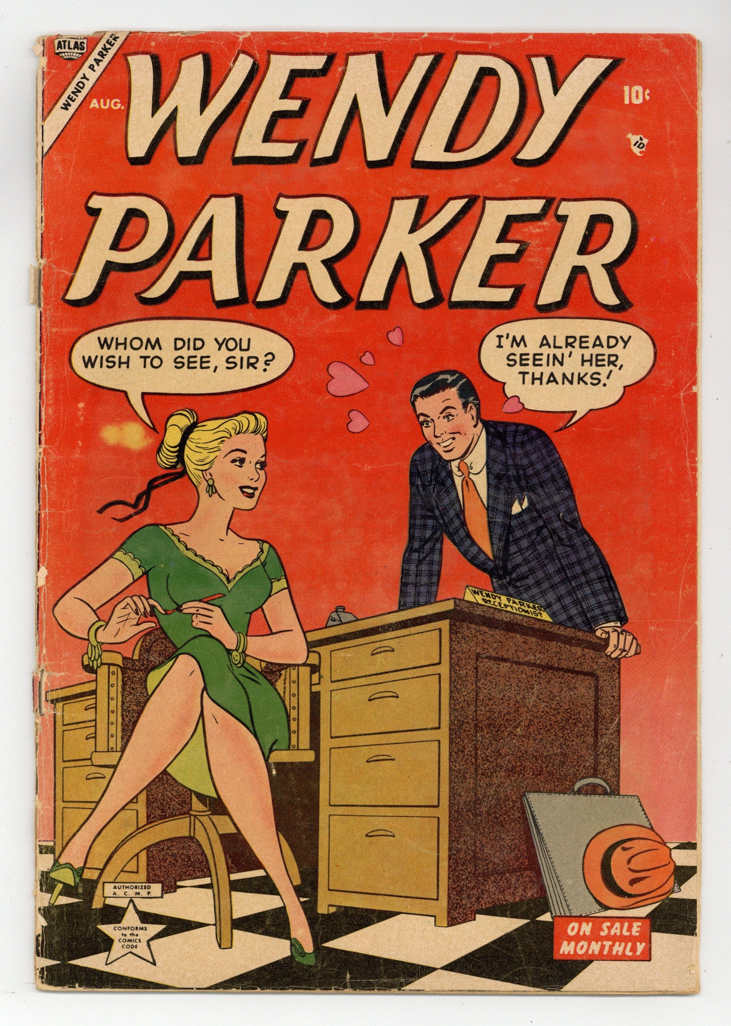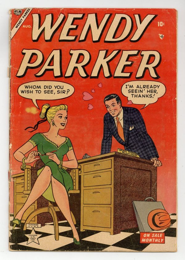 Starts Mar 23 Cover by Christopher Rule. Stories by unknown. Art by Christopher Rule and Morris Weiss. Three untitled Wendy Parker stories with art by Christopher Rule: Wendy has a book report due on Monday and instead of reading the book, the plan is to watch a television play version of the book on Sunday night; Wendy has an idea of how to better use her savings rather than leaving the money in the bank; and Wendy hopes to win a thousand dollars on a television quiz show. Plus an untitled Patsy Walker story with art by Morris Weiss: After seeing a movie, Patsy demands that Buzz gives her a token to show how he feels about her. And 2-page reprint? text story "Quiet, Please!" with illo by Frank Frazetta (note: illo is taken from the psa "Prayer Works Wonders," the entirety of which was printed previously in Lovers (1949 Atlas) #43): Rhoda is dating "Silent Steve" and is desperate to get him to be more talkative. 32 pages, full color. Cover price $0.10. Grade: FR 1.0 explanation of grade Condition: Used (collectible)